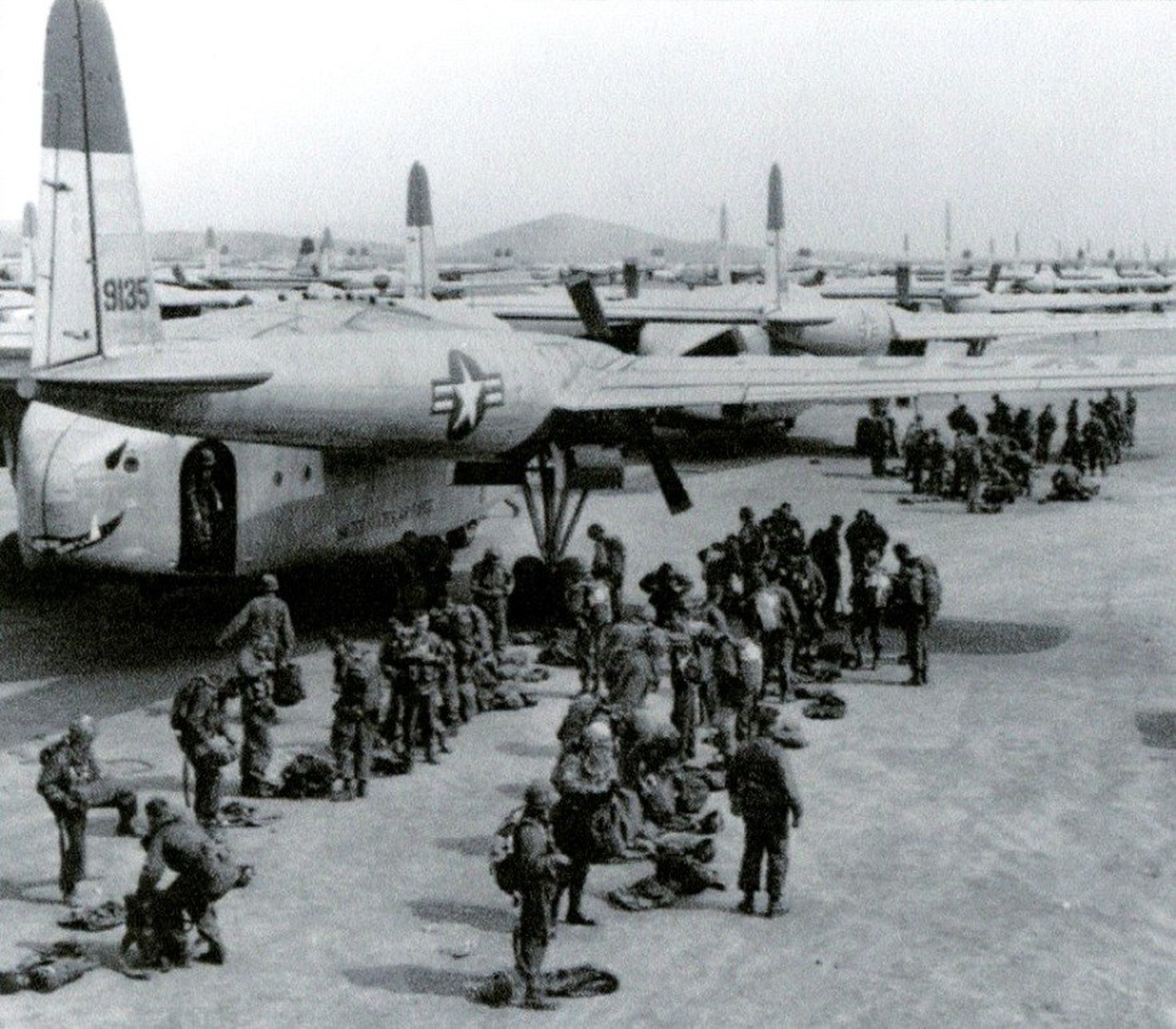Paratroopers board C-119s for the Munsan-ni airdrop (Operation Tomahawk) on March 23, 1951