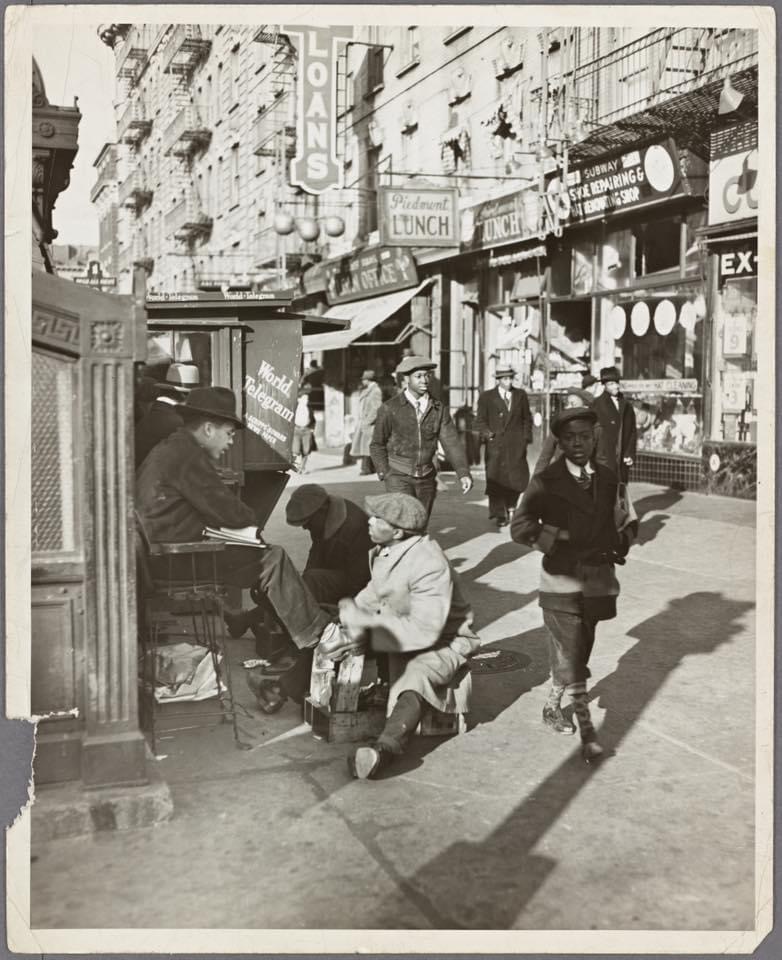 “View of Lenox Avenue, Harlem, at 135th Street, showing businesses, pedestrians and shoe-shine stand.”