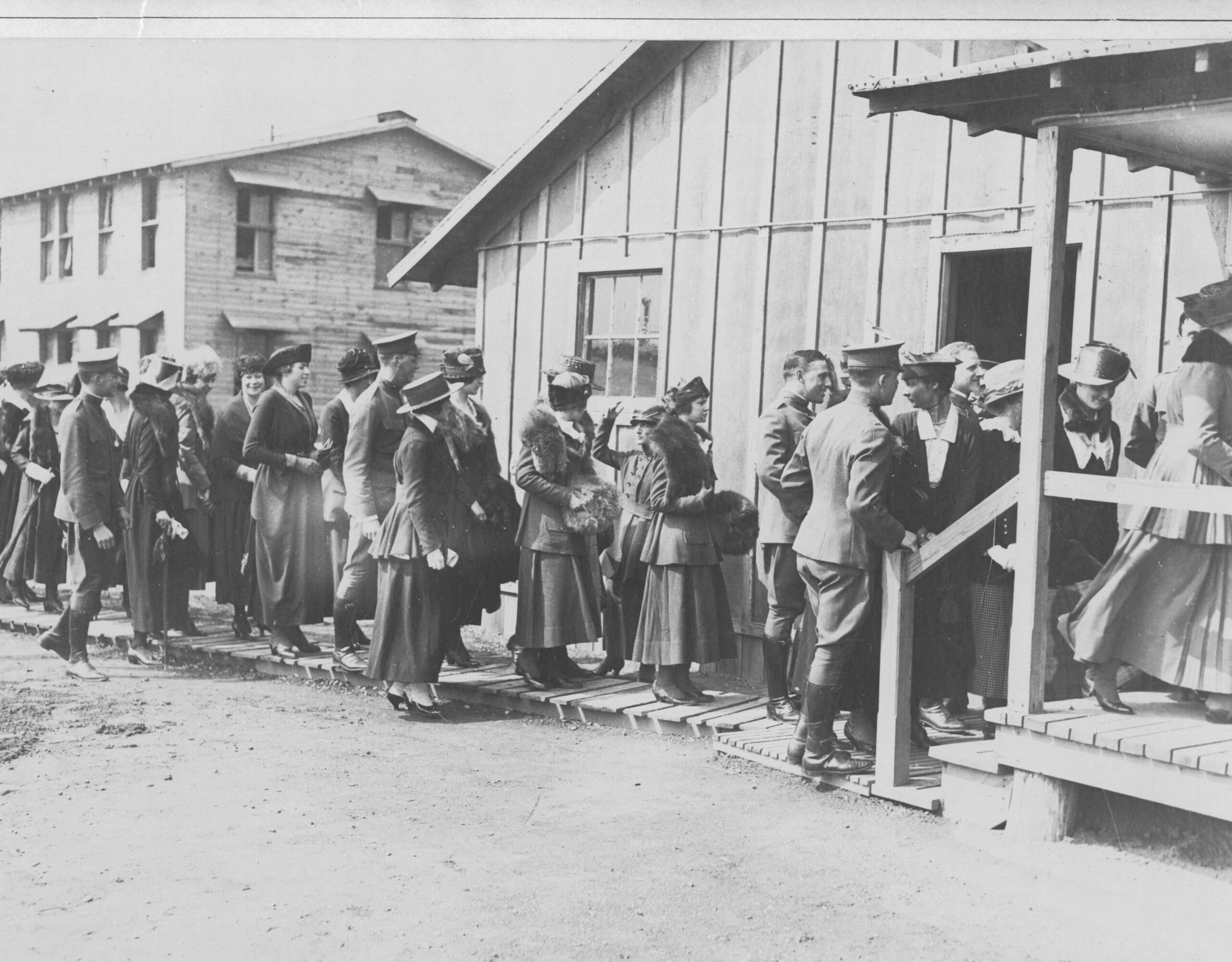 Society girls, members of the Junior Book Committee, American Library Association, War Service, arriving at headquarters of Gen. Scott at Camp Dix, Wrightstown, N.J. The girls visited Camp Dix to ascertain the book needs of the soldiers in training there.
