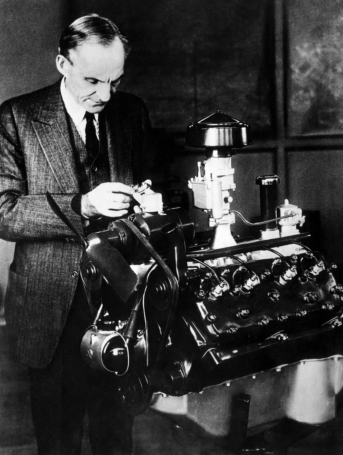 Image of Henry Ford inspecting his new ‘V-8’ motor. c. 1932 via Alamy