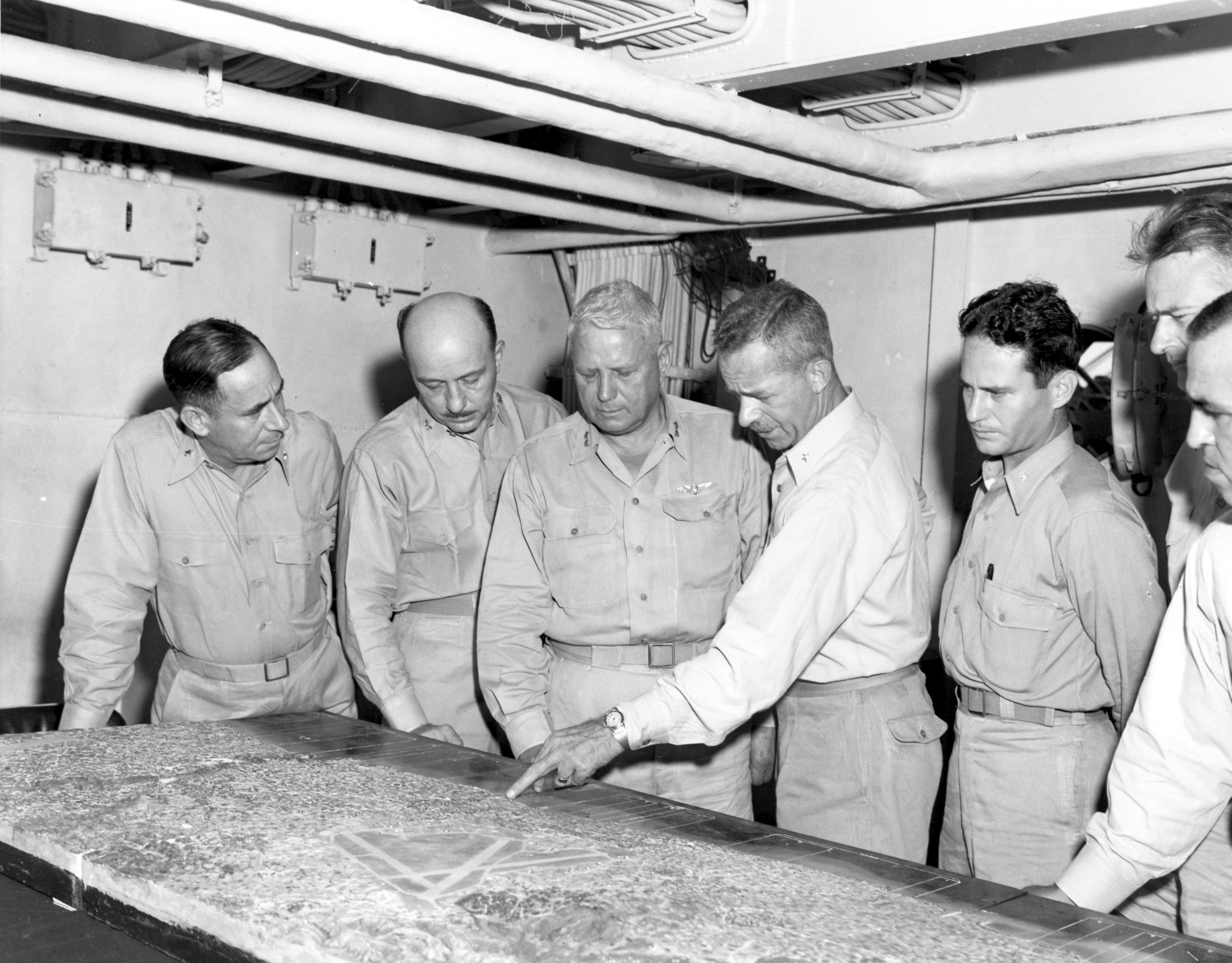 U.S. Marine Corps General Roy S. Geiger (third from left) and staff during the planning of Okinawa Campaign, March 31, 1945