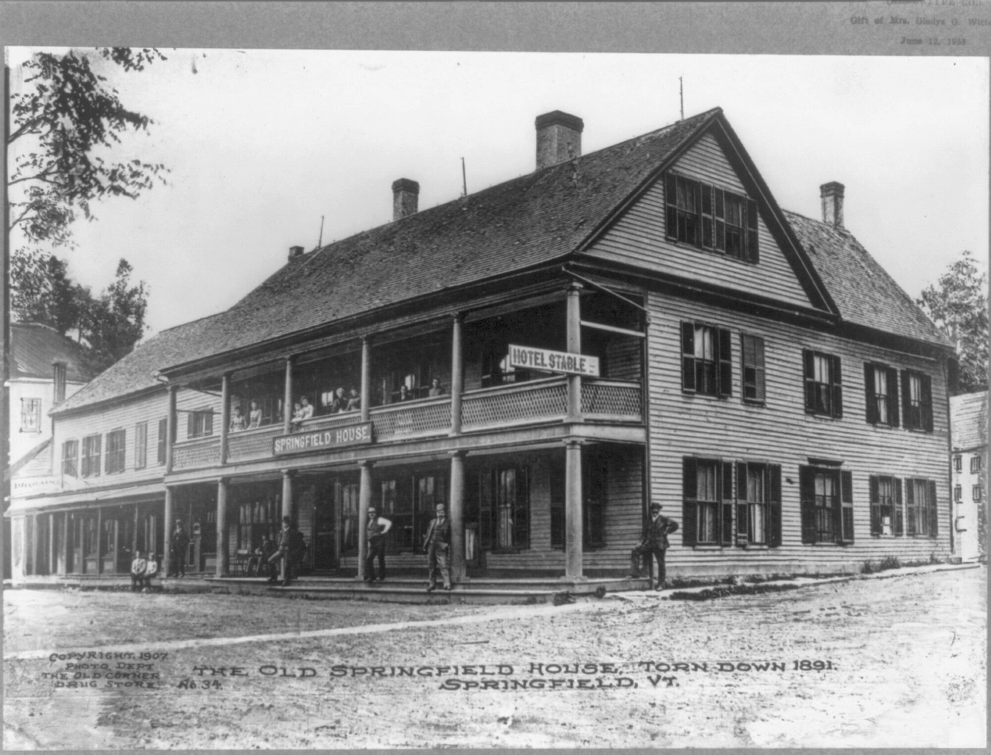 Image of the Old Springfield House, torn down 1891, 100 years after Vermont became a state.