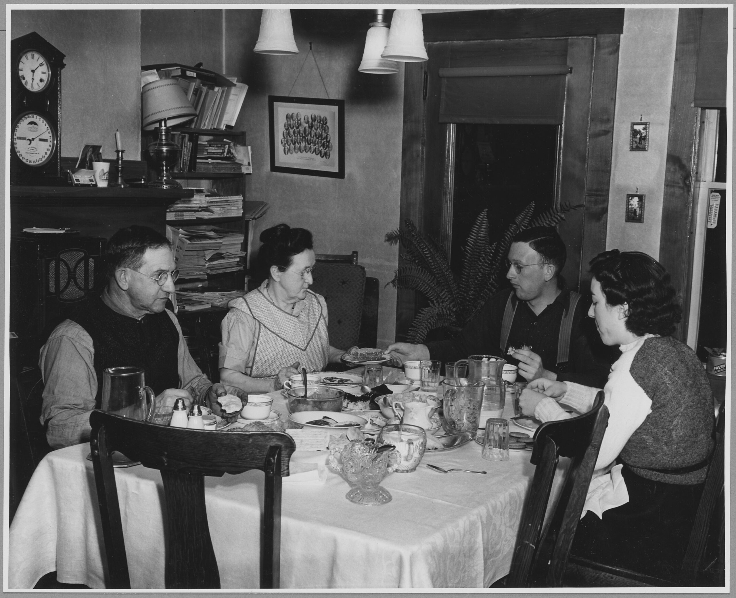 Landaff, Grafton County, New Hampshire. The Chandlers, father, mother, and son, and the school teacher who boards with them have a light supper without hot food. Dinner is at noon at which time, meat, potatoes, vegetables, bread, butter, relish, pies, and milk are served. Very little of the food eaten in this house comes out of cans.