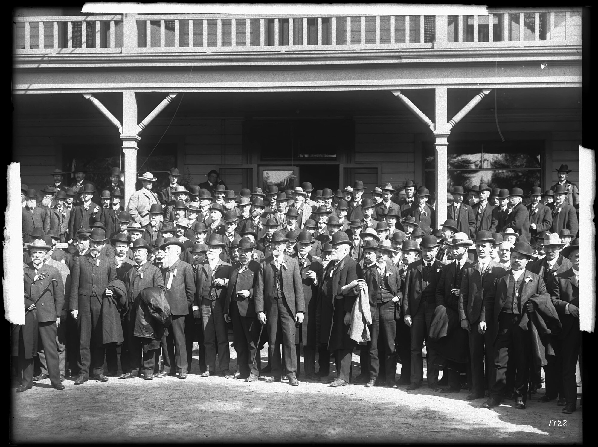Group photo of more than 100 members of the Los Angeles Chamber of Commerce during their excursion to Pomona, California on March 6, 1903