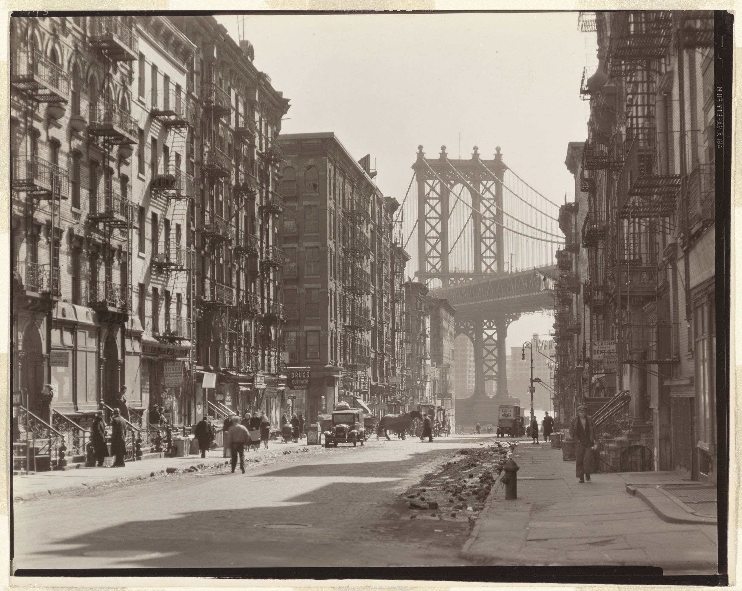 A look down Pike Street toward the Manhattan Bridge in New York.