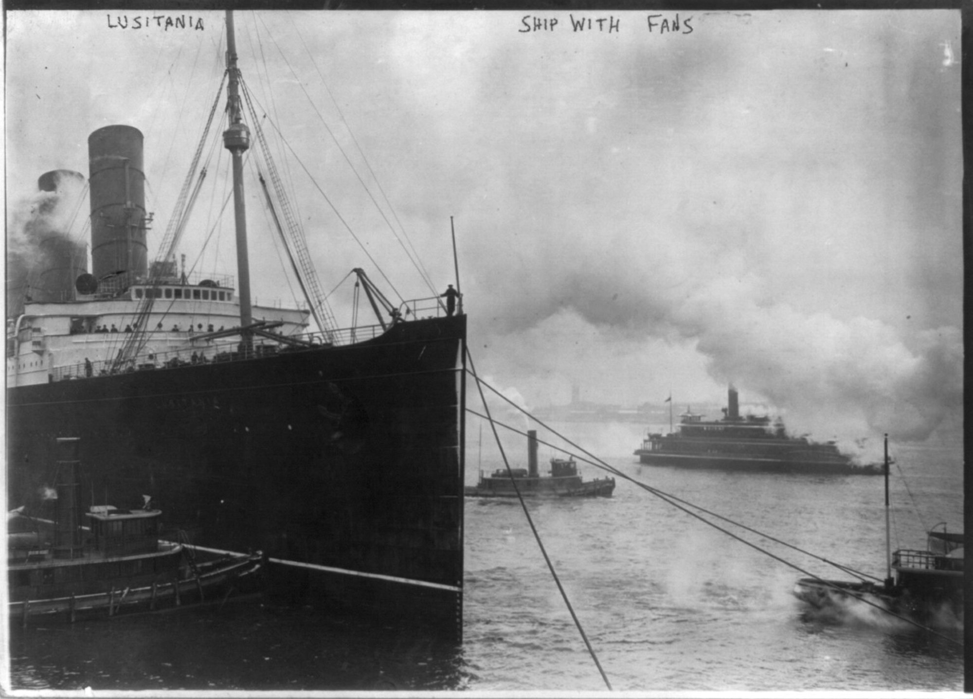LUSITANIA, New York City: view of bow with tugs, March 6, 1914