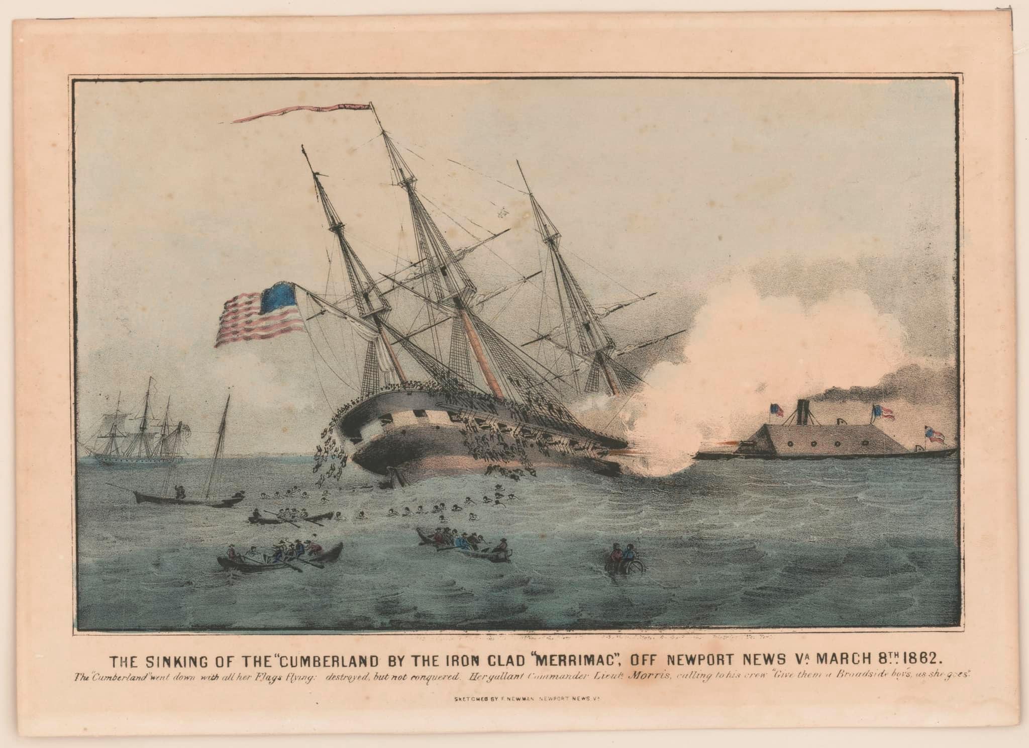 The sinking of the USS Cumberland by the CSS Virginia ironclad (after she was rebuilt from the USS Merrimack) off Newport News, Virginia on March 8, 1862.