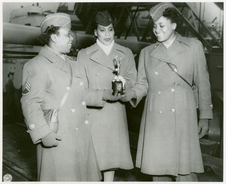 “Led championship team; The basketball team representing the 6888th Central Postal Directory, only African American WAC [Women’s Army Corps] unit to serve overseas, won the WAC Theater Basketball Championship of the ETO while stationed in Rouen, France; The last contingent of the 6888th returned to the States on Friday, March 8; with it left to right: Staff Sergeant Doris L. Paige, Ocean Springs, Mississippi, the team’s coach; First Lieutenant Mercedes Jordan, New York City, the unit’s Special Service Officer; and Technician Fifth Grade Gertrude Cruse, Cincinnati, Ohio, who captained the championship team; In addition to the trophy pictured above which was awarded the team, individual members were presented with self-winding wrist watches.”