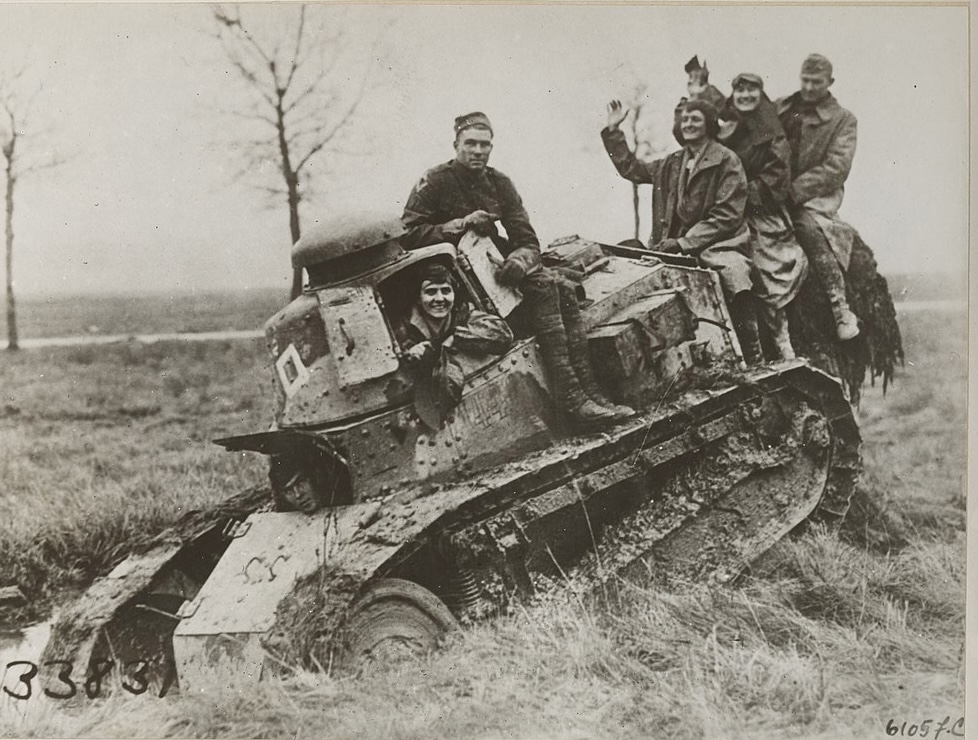While providing humanitarian aid in France, female relief workers and students from Smith College, Northampton, Mass., joined soldiers for a ride on a tank belonging to the 331st Infantry.