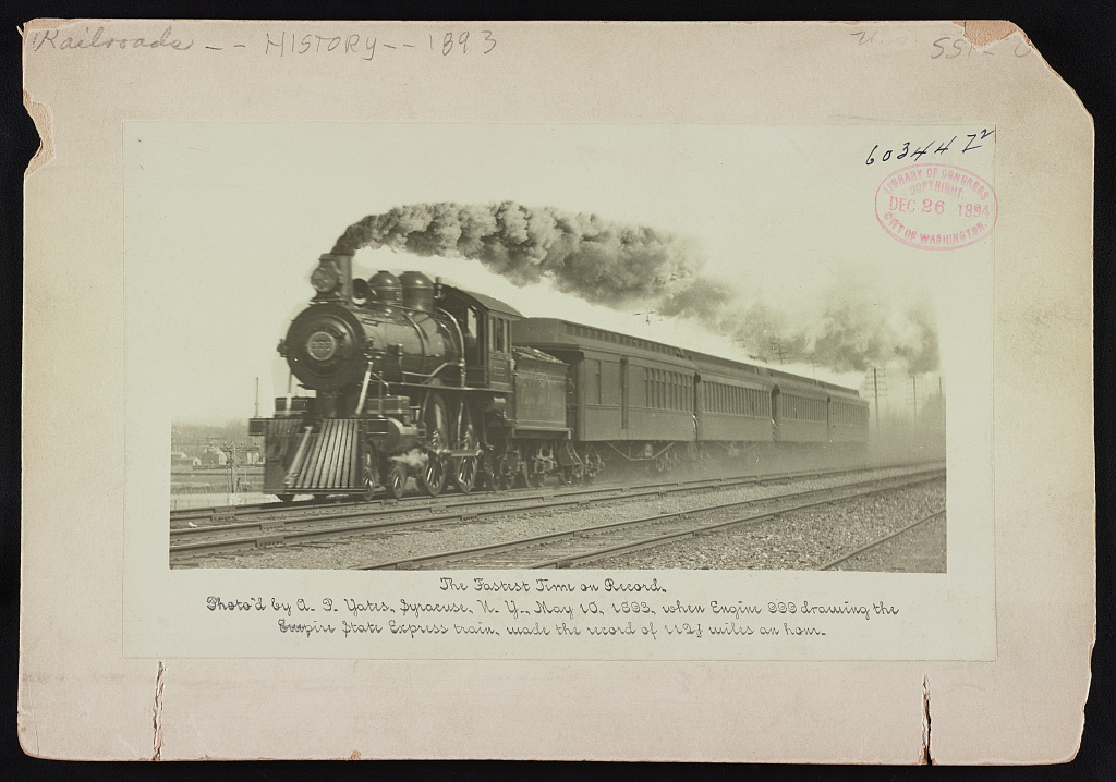 On May 10, 1893, Engine 999, a steam locomotive pulling the Empire State Express, set a world land speed record by reaching 112.5 miles per hour. Operated by the New York Central Railroad, the train ran between Syracuse and Buffalo, New York. At the time, this achievement made Engine 999 the fastest land vehicle in the world, a record it held for nearly a decade.