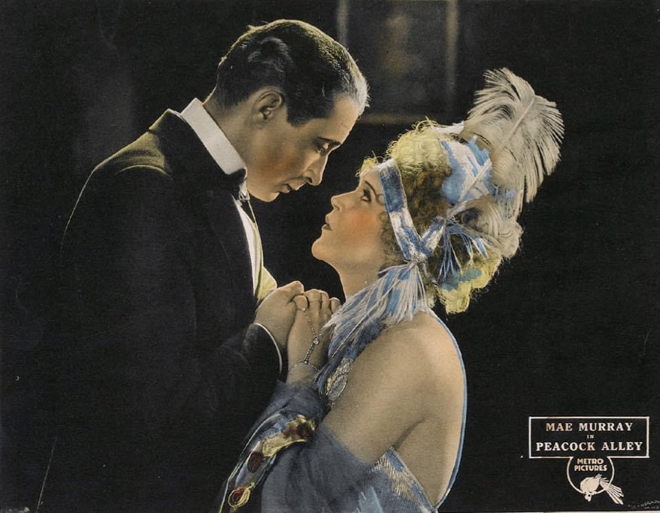 Lobby card showing American actress Mae Murray with Monte Blue in the silent film Peacock Alley in 1922