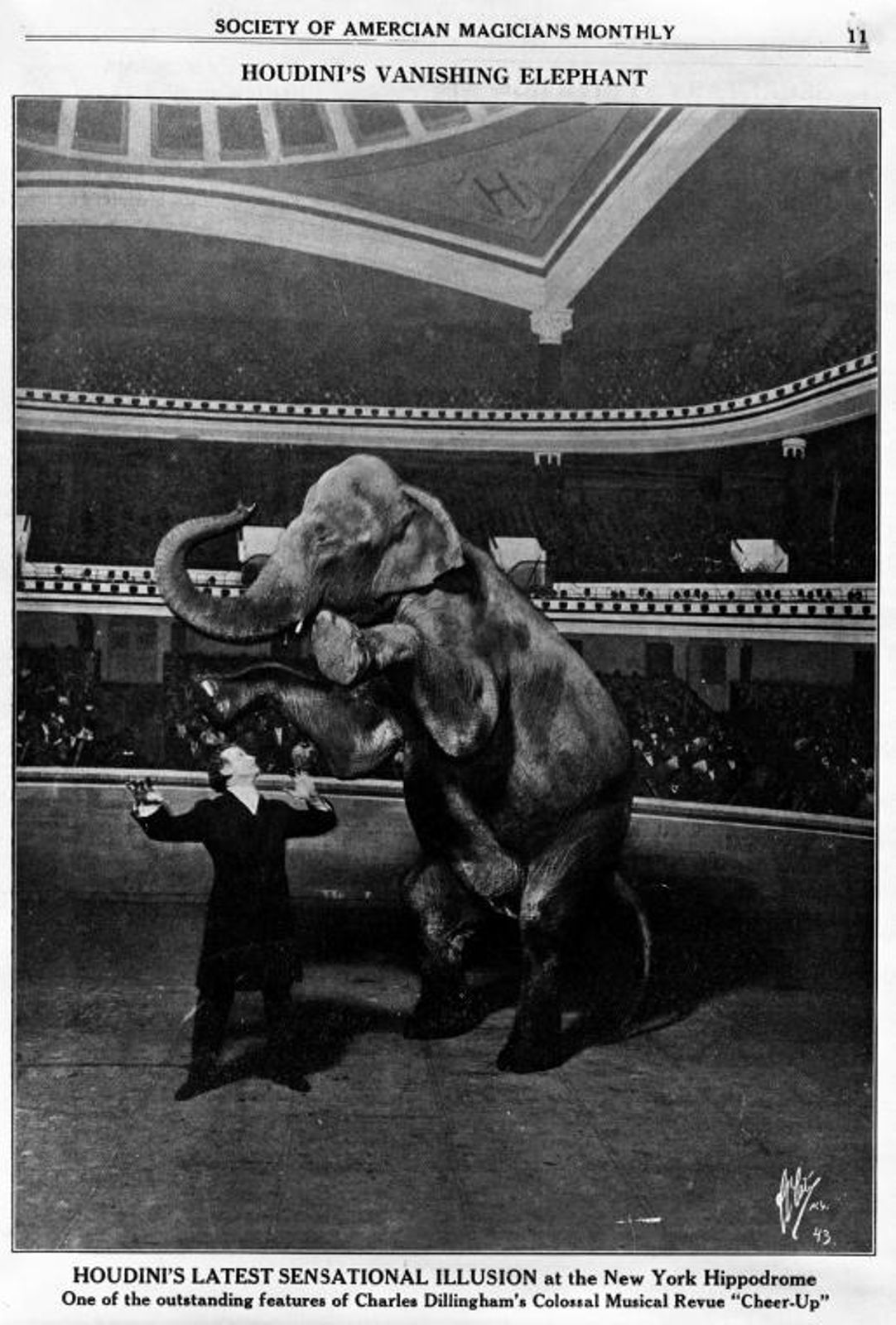 Image of “Houdini’s Vanishing Elephant” that appeared in the Society of American Magicians Monthly in 1918 via NYPL Digital Collections, no known restrictions