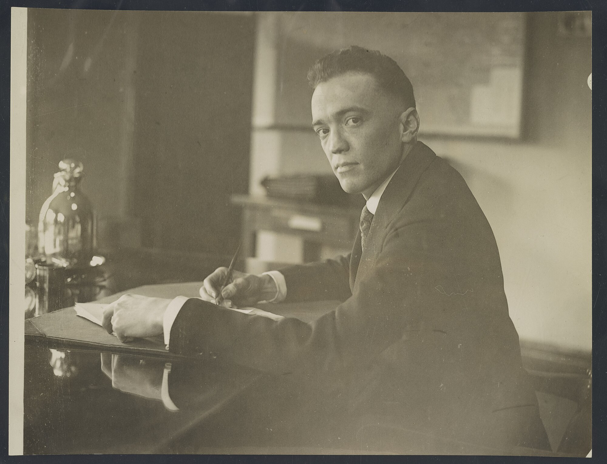 A photo of J. Edgar Hoover at desk, holding a pen, taken about 100 years ago which was the same year he became Director of the Bureau of Investigation (BOI) on May 10, 1924.