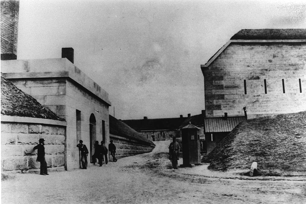 Image: The guardhouse (left) and sentry box (on right) at the entrance to Fort Warren about 1861 via Wikimedia Commons, public domain