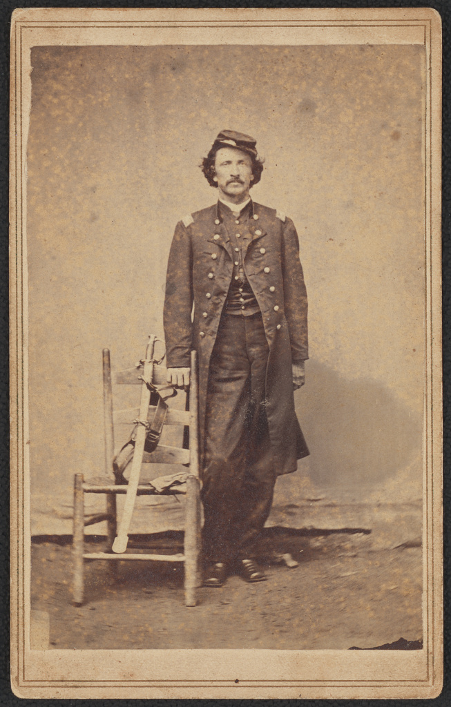 Colonel French B. Woodall of Co. K, 16th Illinois Infantry Regiment and Co. C, 151st Illinois Infantry Regiment in uniform displaying sword of Confederate Brigadier General William T. Wofford after his surrender of Kingston, Georgia on May 12, 1865.