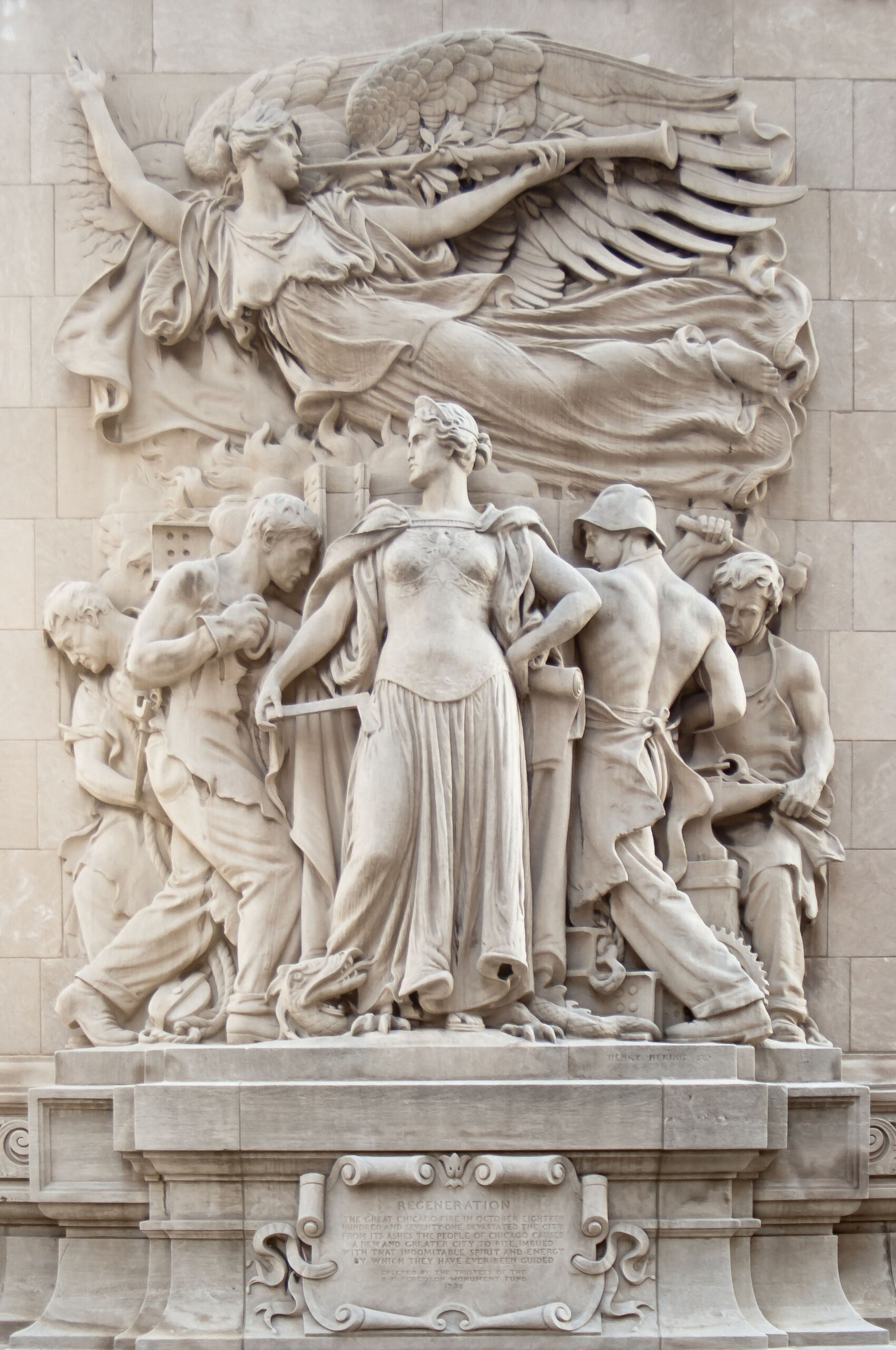The bridge features four bas-reliefs, including “Regeneration” (shown), which symbolizes the city’s renewal after the Great Fire of 1871 and highlights the transformative power of the arts in rebuilding civilization.