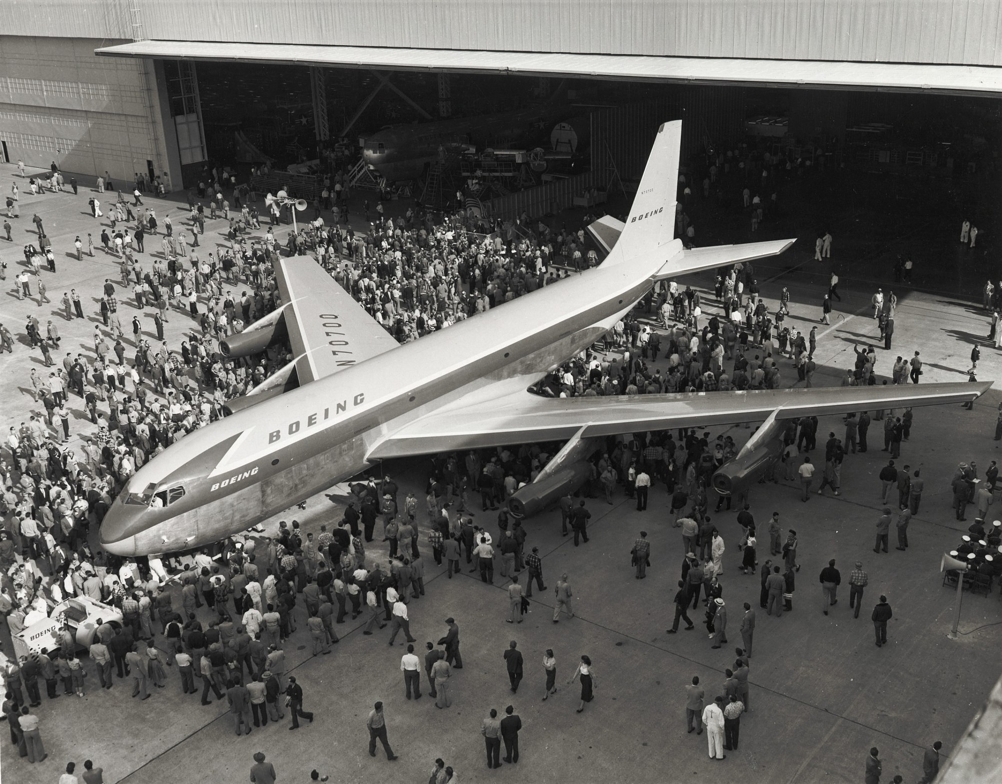 Image: Roll out of the Boeing 707 on May 14, 1954 via Wikimedia Commons, public domain