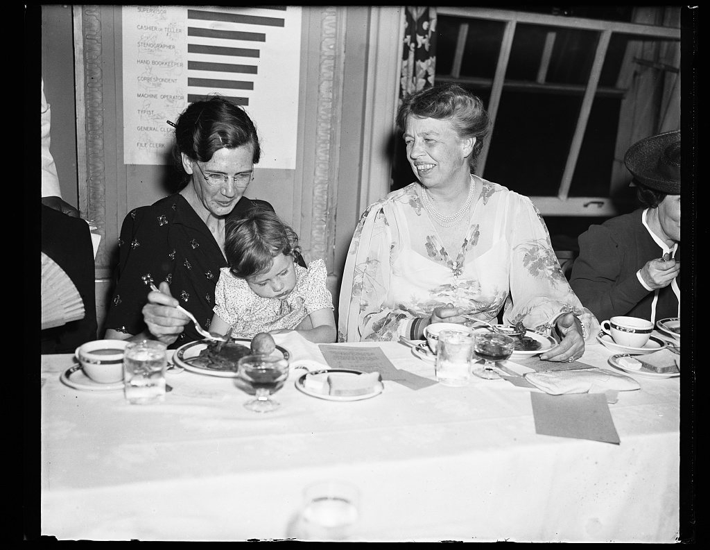 First Lady Eleanor Roosevelt eating a five cent meal during a relief dinner. Sitting next to her is a mother on relief and a three-year-old child.
