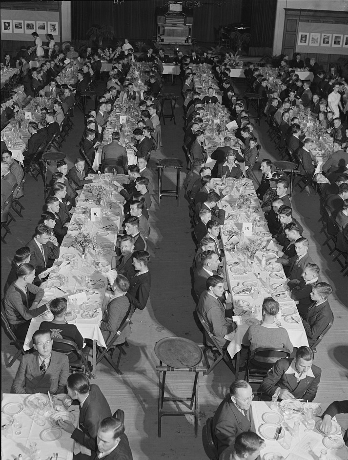 A banquet held for high school students at the Iowa High School Agricultural Congress at Iowa State College. Ames, Iowa. May 15, 1942. High school students from all over the state came to participate in judging contests, discussions, etc., in all branches of agriculture