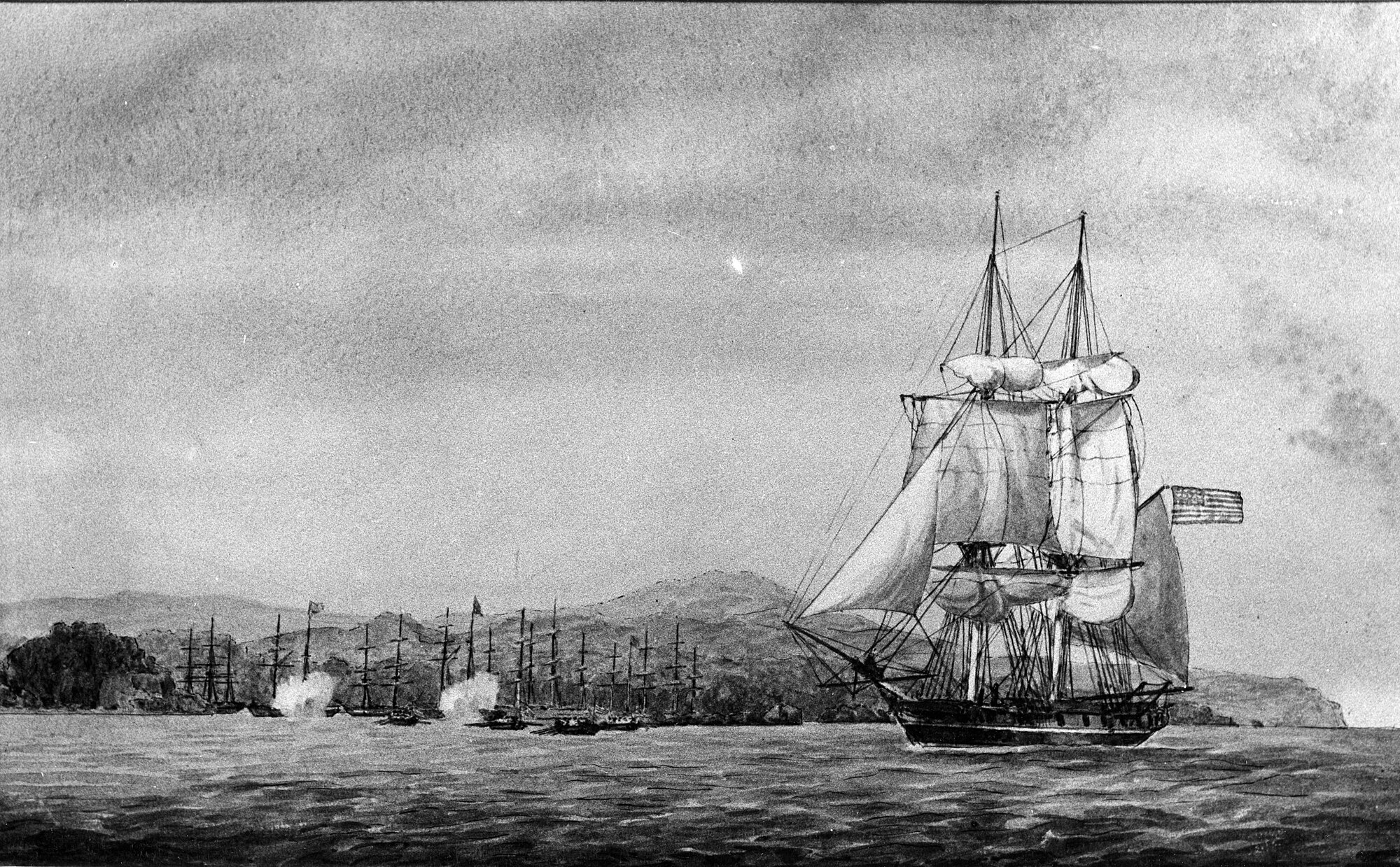 Image of the Brig USS Alligator capturing piratical schooners of Mantanzas, Cuba c. 1822