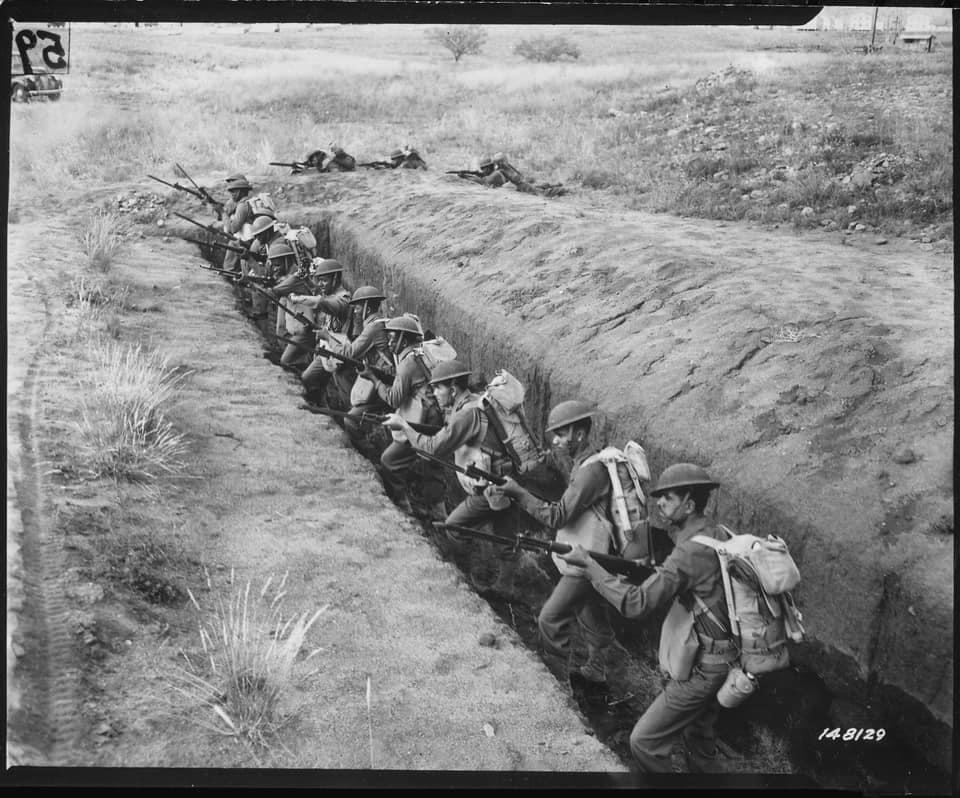The 93rd Infantry Division reactivated May 15, 1942, was the first African American division to be formed during World War II. 2nd Lieutenant Arthur Bates waits for zero hour to give the command to attack. Fort Huachuca, Arizona, 1942