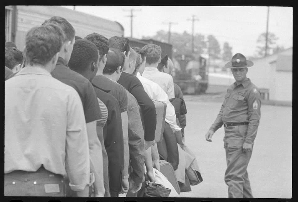 Young men who have been drafted wait in line to be processed into the U.S. Army at Fort Jackson, Columbia, South Carolina