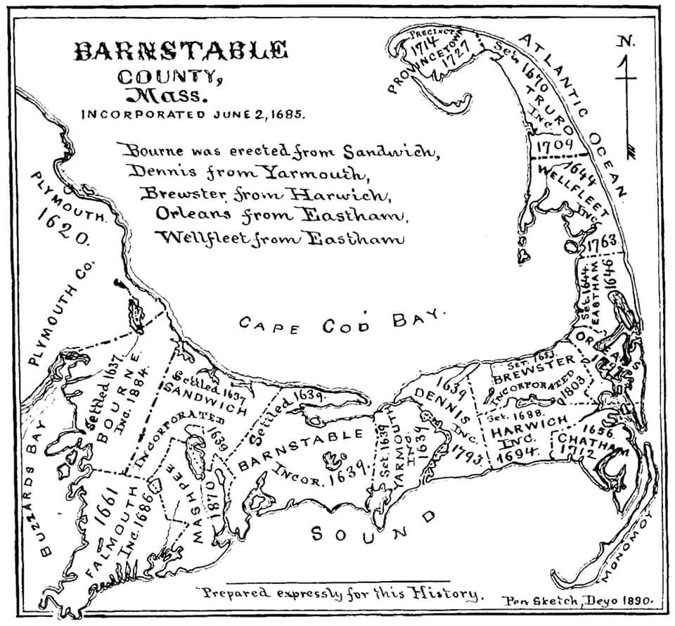 “But on Friday the foureteenth of May, early in the morning, we made the land, being full of faire trees, the land somewhat low, certeine hummocks or hilles lying into the land, the shore ful of white sand, but very stony or rocky. And standing faire alongst by the shore, about twelue of the clocke the same day, we came to an anker, where sixe Indians, in a Baske-shallop with mast and saile, an iron grapple, and a kettle of copper, came boldly aboord vs, one of them apparelled with a wastcoat and breeches of blacke serdge, made after our sea-fashion, hose and shoes on his feet; all the rest (sauing one that had a paire of breeches of blue cloth) were all naked. These people are of tall stature, broad and grim visage, of a blacke swart complexion, their eie-browes painted white; their weapons are bowes and arrowes: it seemed by some words and signes they made, that some Basks or of S. lohn de Luz, haue fished or traded in this place, being in the latitude of 43 degrees. But riding heere, in no very good harbour, and withall, doubting the weather, about three of the clocke the same day in the afternoone we weighed, & standing Southerly off into sea the rest of that day and the night following, with a fresh gale of winde, in the morning we found ourselues embayed with a mightie headland; but comming to an anker about nine of the clocke the same day, within a league of the shore, we hoised out the one halfe of our shallop, and captaine Bartholomew Gosnold, my selfe, and three others, went ashore, being a white sandie and very bolde shore ; and marching all that afternoon with our muskets on our necks, on the highest hilles which we saw (the weather very hot) at length we perceiued this headland to be parcell of the maine, and sundrie Islands lying almostround about it: so returning (towards evening) to our shallop (for by that time, the other part was brought ashore and set together) we espied an Indian, a yong man, of proper stature, and of a pleasing countenance ; and after some familiaritie with him, we left him at the sea side, and returned to our ship, where, in fiue or sixe houres absence, we had pestered our ship so with Cod fish, that we threw numbers of them ouer-boord againe: and surely, I am persuaded that in the moneths of March, April, and May, there is vpon this coast, better fishing, and in as great plentie, as in Newfoundland: for the sculles of Mackerell, herrings, Cod, and other fish, that we dayly saw as we went and came from the shore, were wonderfull; and besides, the places where we tooke these Cods (and might in a few daies haue laden our ship) were but in seuen faddome water, and within lesse than a league of the shore; where, in Newfoundland they fish in fortie or fiftie fadome water, and farre off. From this place, we sailed round about this headland, almost all the points of the compasse, the shore very bolde: but as no coast is free from dangers, so I am persuaded, this is as free as any ; the land some- what lowe, full of goodly woods..”