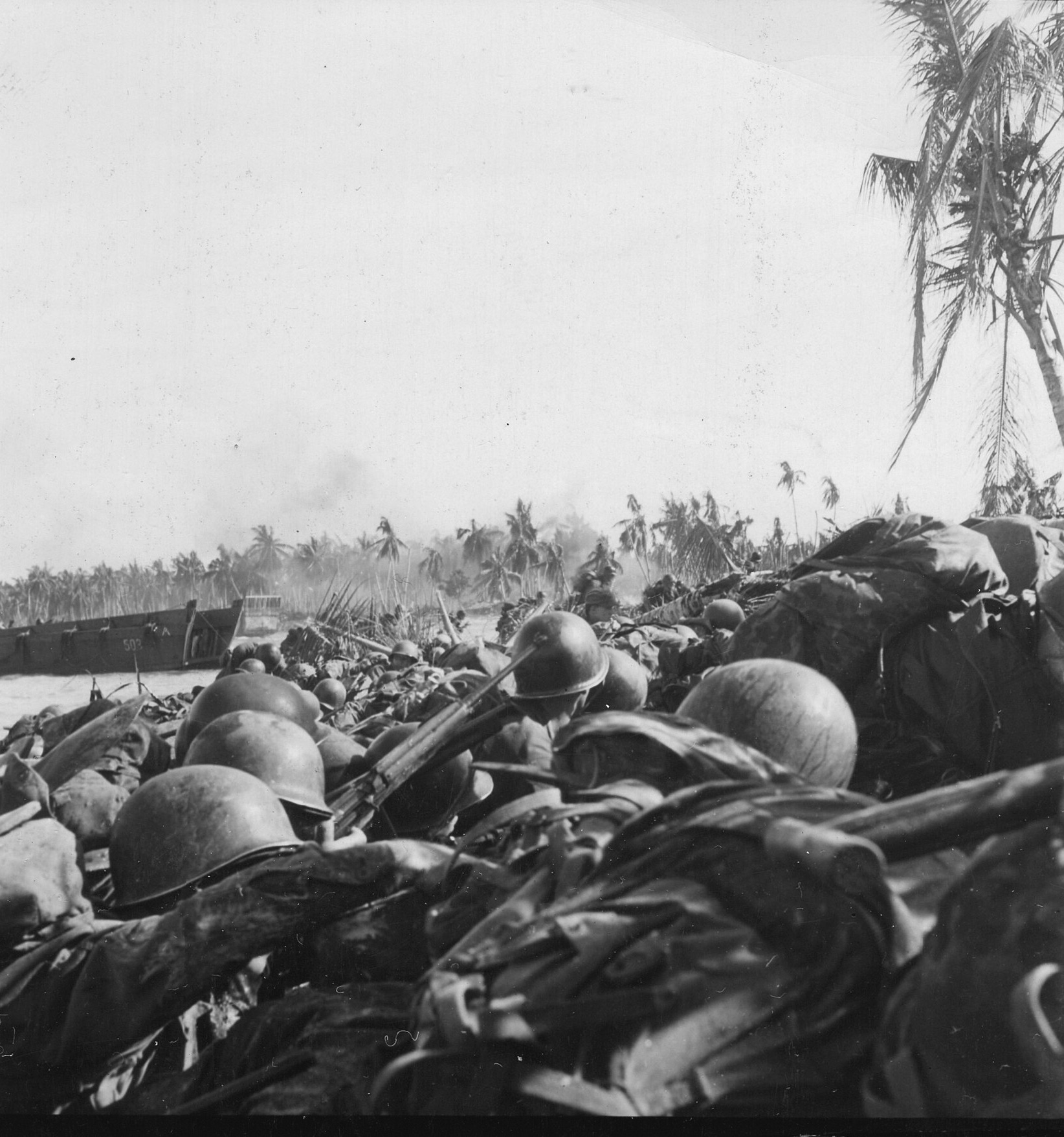 Infantry of the 163rd Regiment, 41st Division, pinned down on the beach at Wakde on