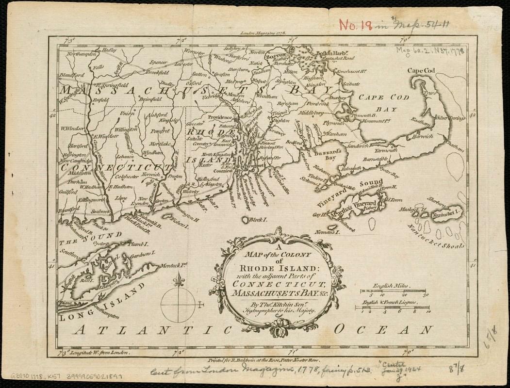 Image of an early map of The Colony of Rhode Island via Digital Commonwealth Massachusetts, no known restrictions