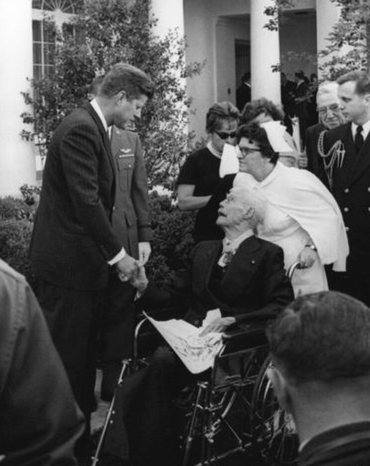 John F. Kennedy shakes hands with retired US Army Major General, Charles E. Kilbourne, at a military reception in honor of recipients of the Medal of Honor.