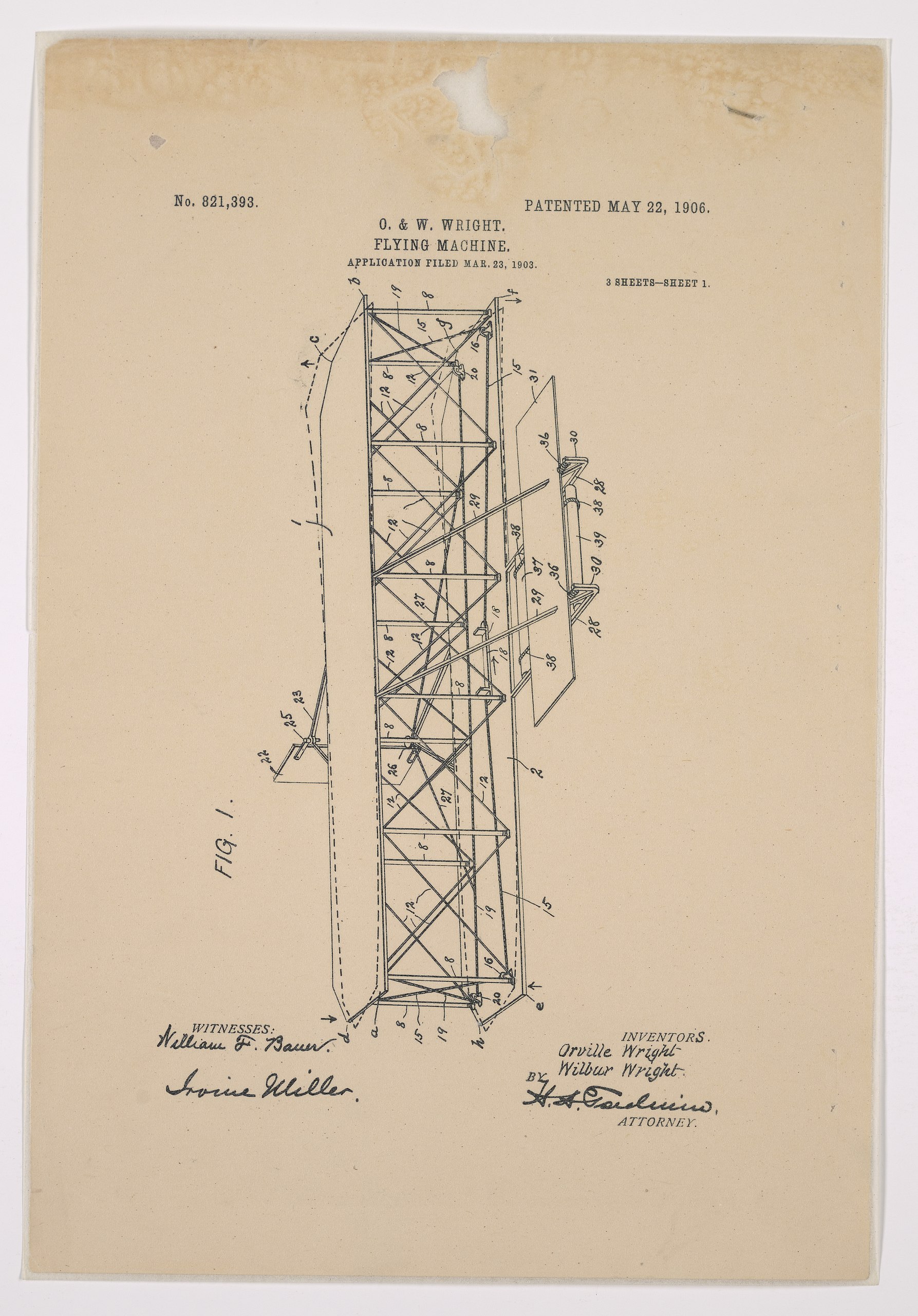U.S. Patent #821,393 that was granted to Orville and Wilbur Wright for their Flying Machine on May 22, 1906.