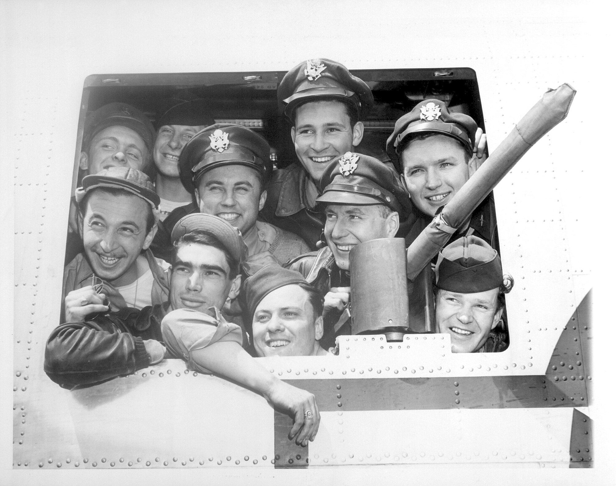 These Yank airmen beam broadly as they look out from their bomber, following their arrival at Bradley Field, Windsor Locks, Conn., May 22, on a flight from Europe. In their bomber “Hell Hen,” they helped to bomb Germany out of the war. 1945.