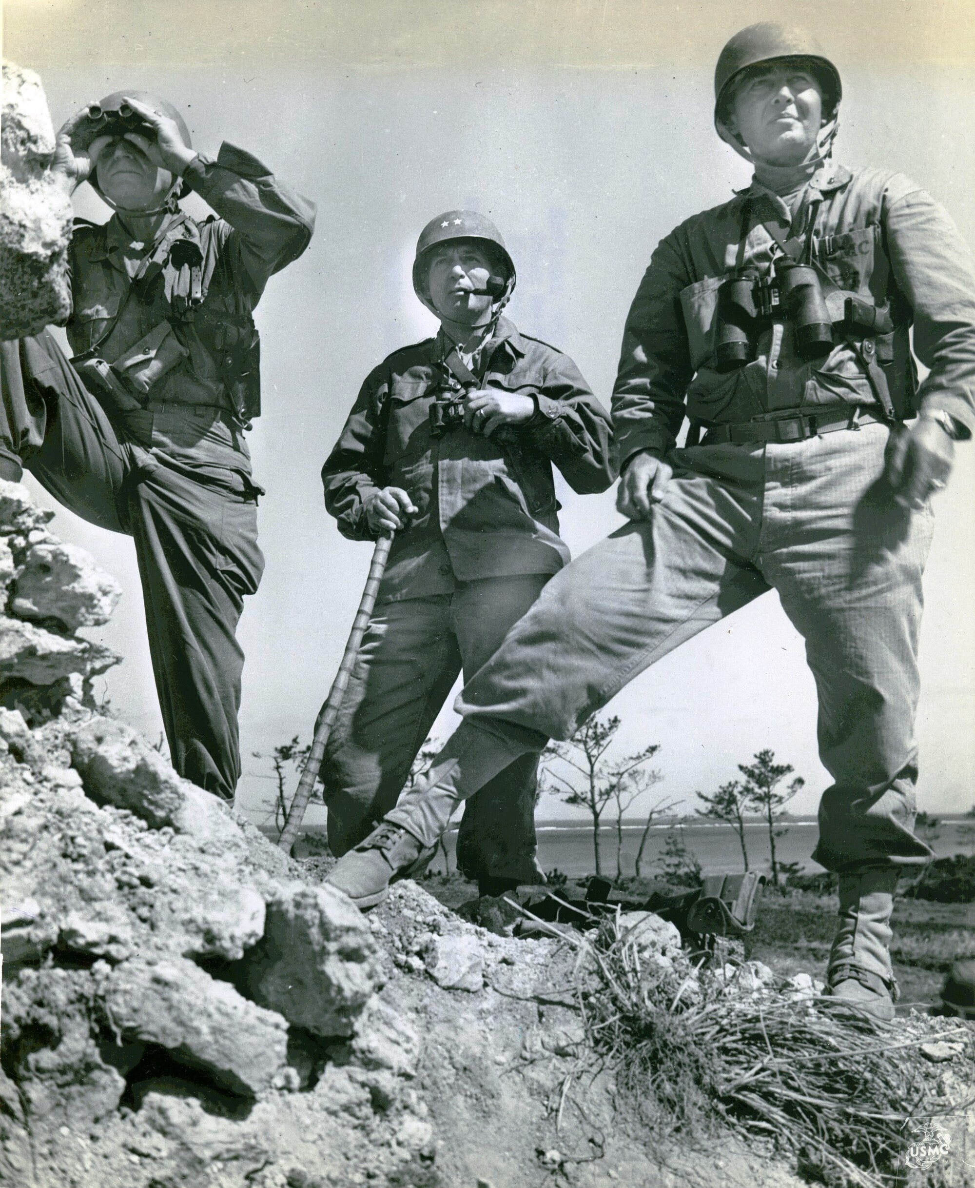 “Watching Their Troops: As the Marines drive toward the capital city of Naha, leaders watch the action from an observation post on a rocky ledge. They are, (left to right): Lieutenant General Simon Bolivar Buckner, Jr., commanding the Tenth Army; Major General Lemuel C. Shepherd, commanding general of the Sixth Marine Division, and his assistant commander, Marine Brigadier General William T. Clement.”