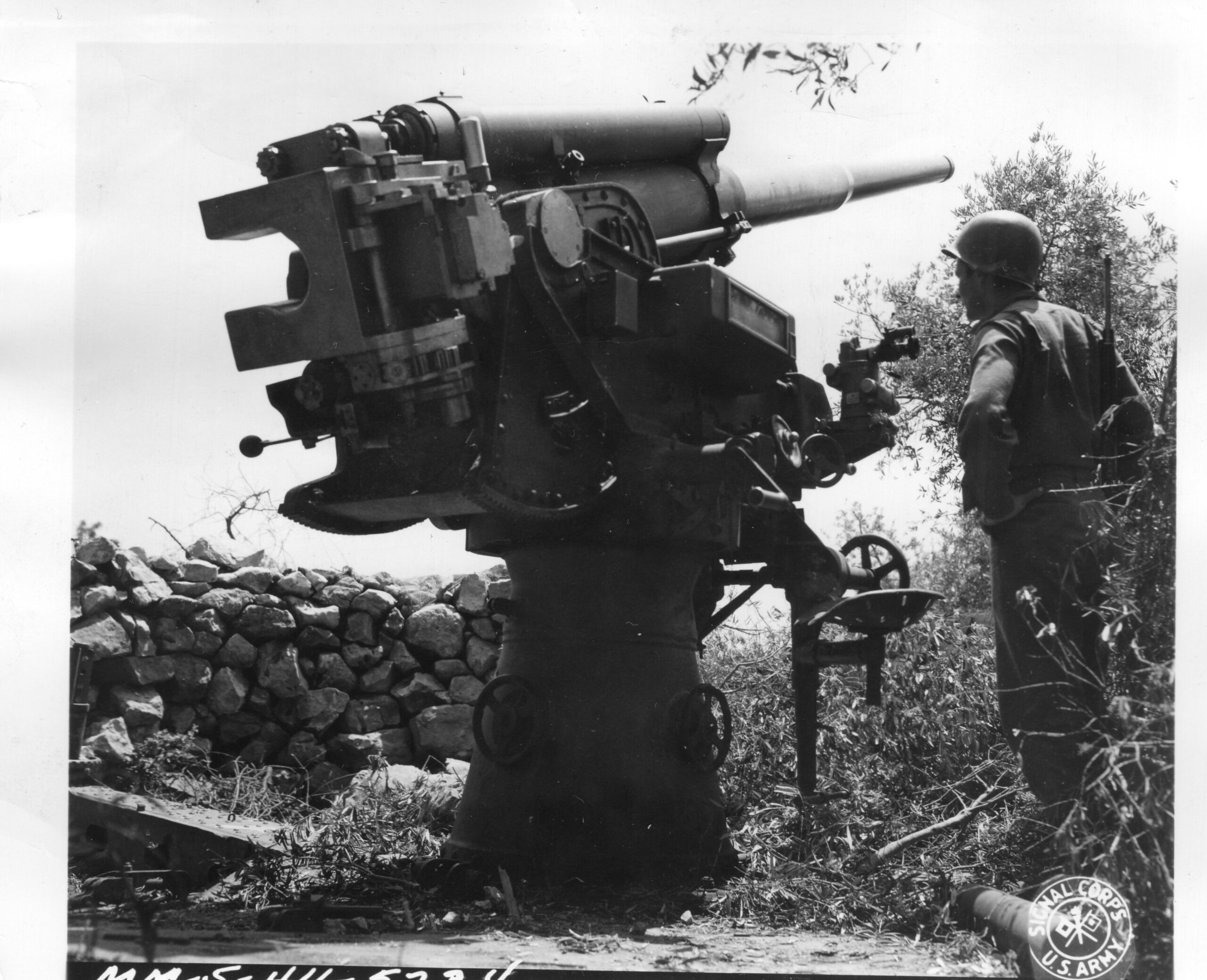 Sgt. Joe Petrowski of the 337th Inf. Regt., examining sights on an 88mm gun abandoned by the Germans. Terracina area, Italy