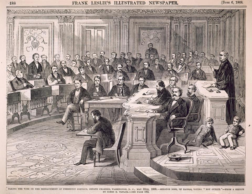 On May 26, 1868, members of the U.S. Senate voted on Articles II & III of impeachment and President Andrew Johnson was acquitted. Image: Votes on the Impeachment of Andrew Johnson in May of 1868 via Wikimedia Commons, public domain