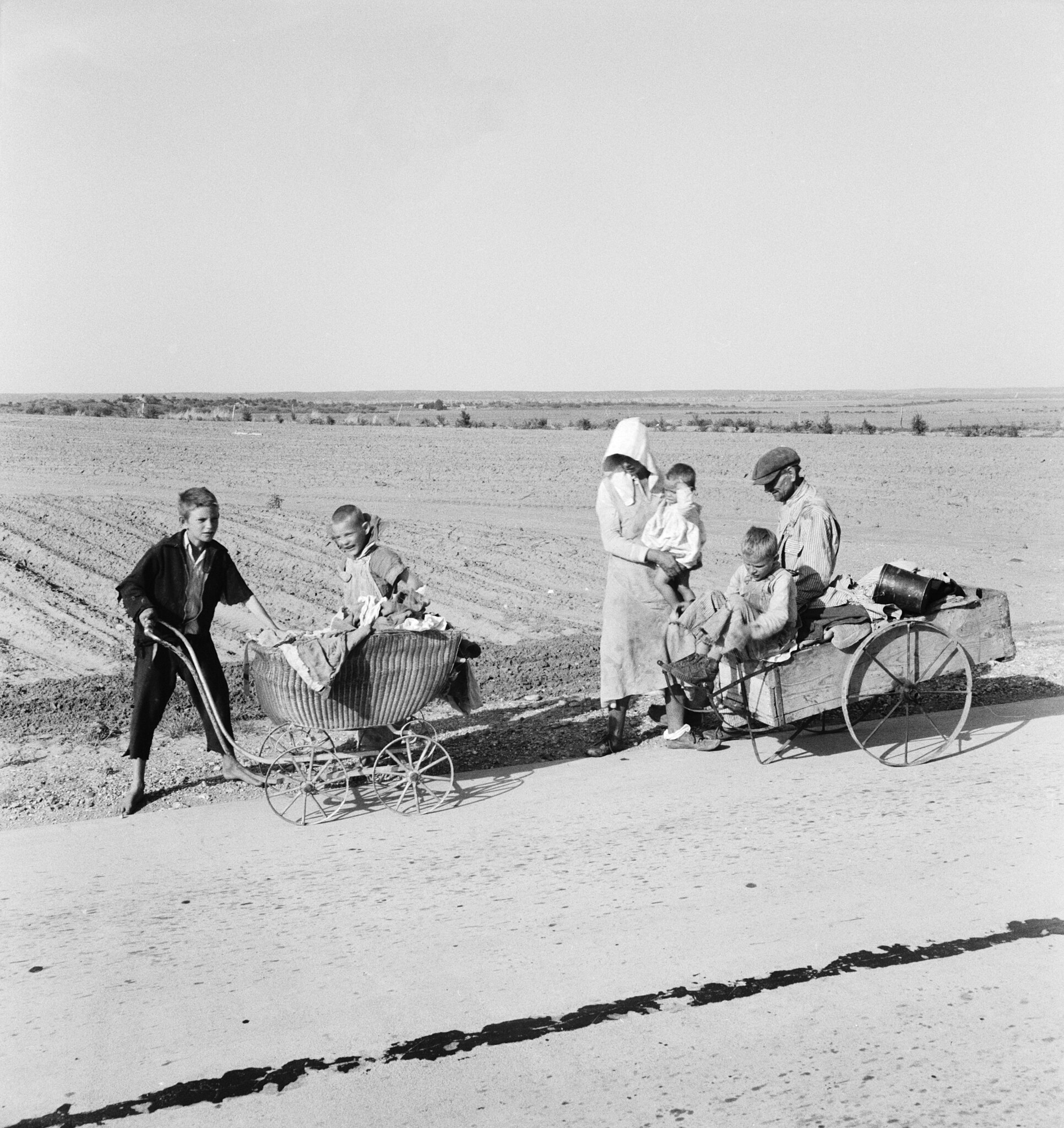 Flood refugee family in Hall County, near Memphis, Texas. These people, with all their earthly belongings, are bound for the lower Rio Grande Valley, where they hope to pick cotton. They are from Arkansas. May 1937 photo by Dorothea Lange who was born on May 26, 1895 in Hoboken, New Jersey. Image via Wikimedia Commons, public domain