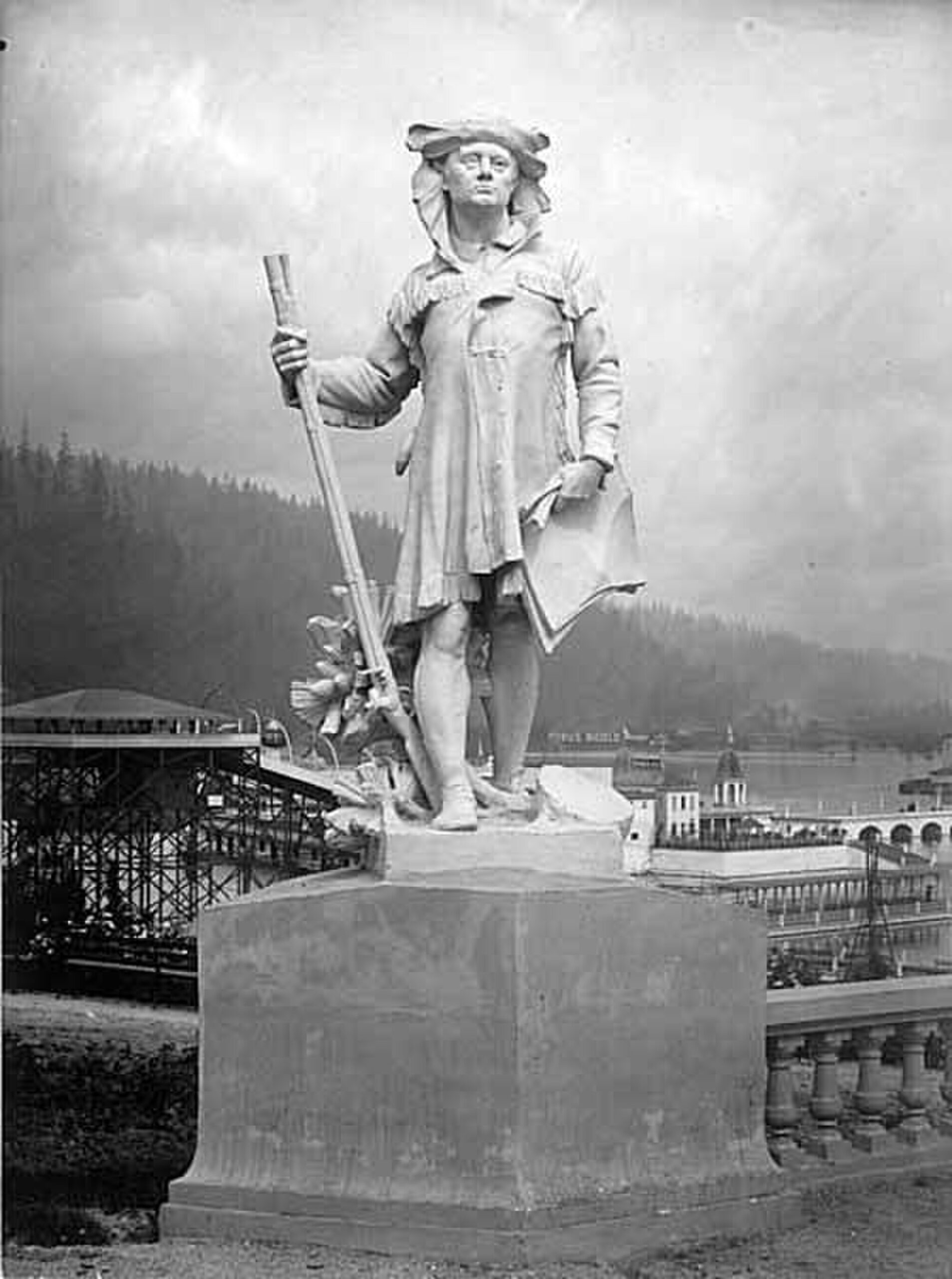 On May 26, 1805 Meriwether Lewis writes in his journal that he sees the Rocky Mountains for the first time… “In the after part of the day I also walked out and ascended the river hills which I found sufficiently fortiegueing. On arriving to the summit [of] one of the highest points in the neighborhood I thought myself well repaid for my labor; as from this point I beheld the Rocky Mountains for the first time, I could only discover a few of the most elevated points above the horizon, the most remarkable of which by my pocket compass I found bore N. 65°. W. being a little to the N. of the N.W. extremity of the range of broken mountains seen this morning by Cap. C. these points of the Rocky Mountains were covered with snow and the sun shone on it in such manner as to give me the most plain and satisfactory view, while I viewed these mountains I felt a secret pleasure in finding myself so near the head of the heretofore conceived boundless Missouri; but when I reflected on the difficulties which this snowy barrier would most probably throw in my way to the Pacific, and the sufferings and hardships of myself and party in them, it in some measure counterballanced the joy I had felt in the first moments in which I gazed on them; but as I have always held it a crime to anticipate evils I will believe it a good comfortable road untill I am compelled to believe differently…” Image c. 1905 Statue of Meriwether Lewis created by American sculptor Charles Albert Lopez in Portland, Oregon via Wikimedia Commons, public domain