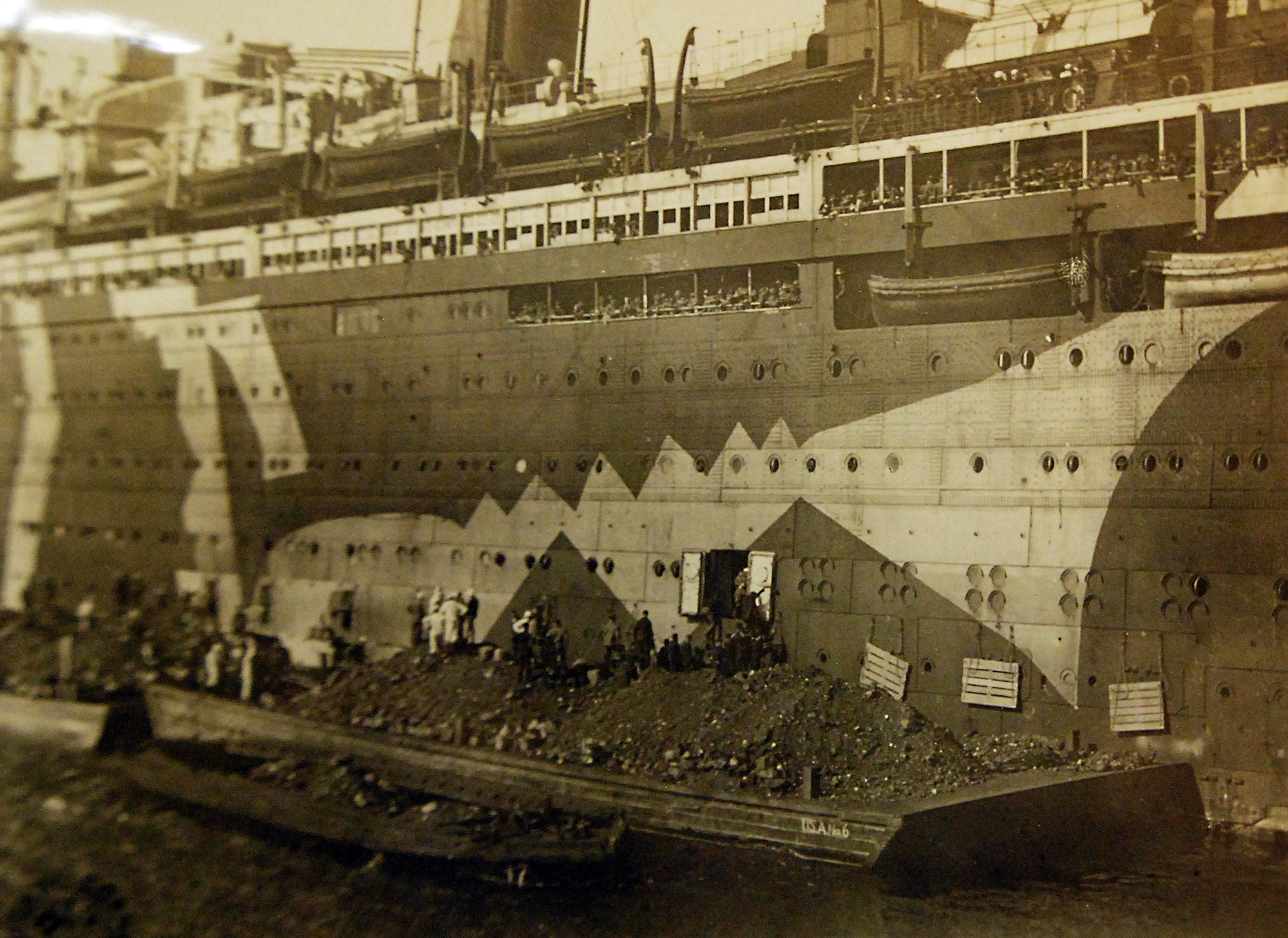 The USS Leviathan (formerly the Hamburg Line’s “Vaterland”) being filled with coal at Brest, France on May 30, 1918. The ship was commandeered and refitted by the U.S. Government when war was declared on Germany. It was converted into an Army Transport for American troops.