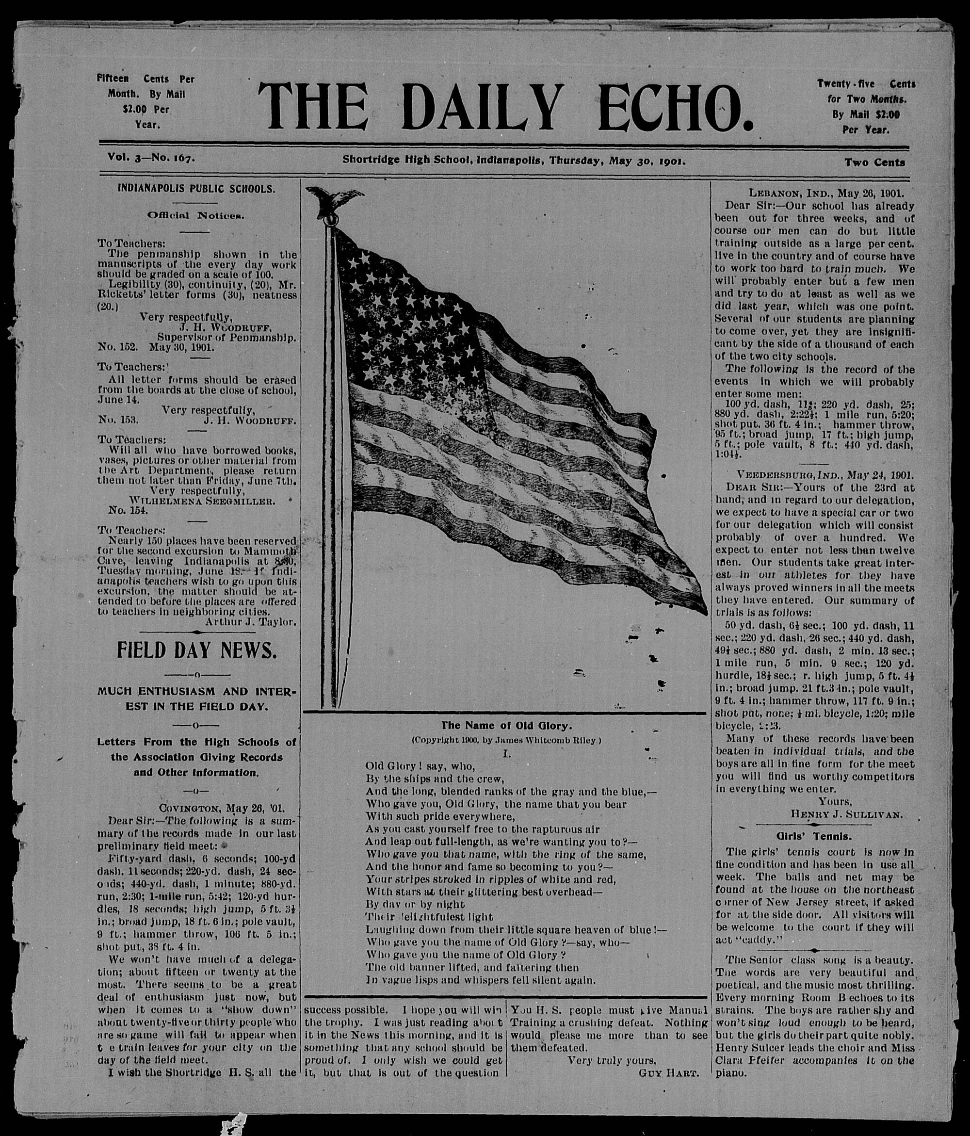 The front page of the Daily Echo newspaper, published by the students of Shortridge High School on Thursday, May 30, 1901