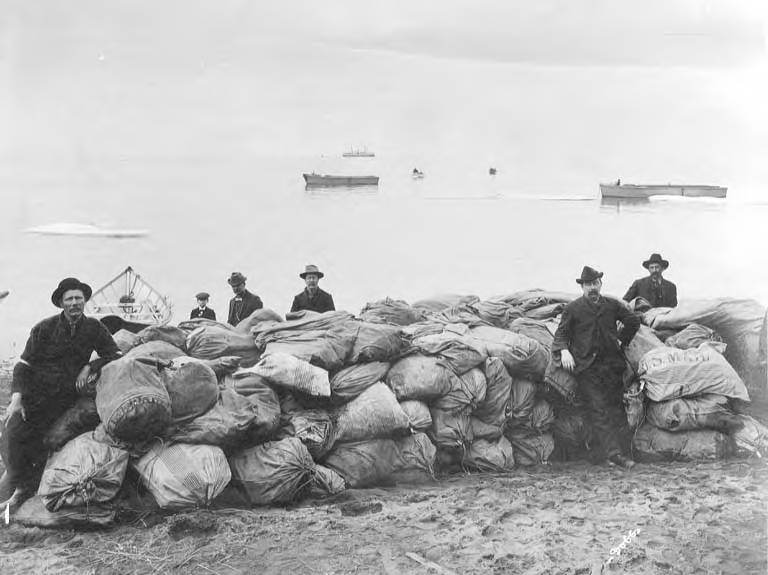 Arrival of the first mail in Nome by the steamer Corwin with men standing next to large stack of mailbags on beach, Nome, Alaska