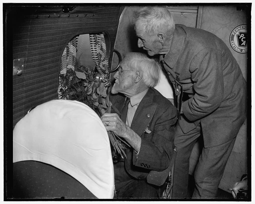 Heroes of battle of Gettysburg paid tribute by surviving brothers-in-arms. Washington, D.C., May 30, Although there are only a few of the boys in blue and gray left, two of them were strong enough today, Memorial Day, to drop flowers from the air on the Gettysburg battlefield to honor their comrades who lost their lives in this historic battle of the Civil War. Here we see, left to right: William H. Jackson and Robert W. Wilson