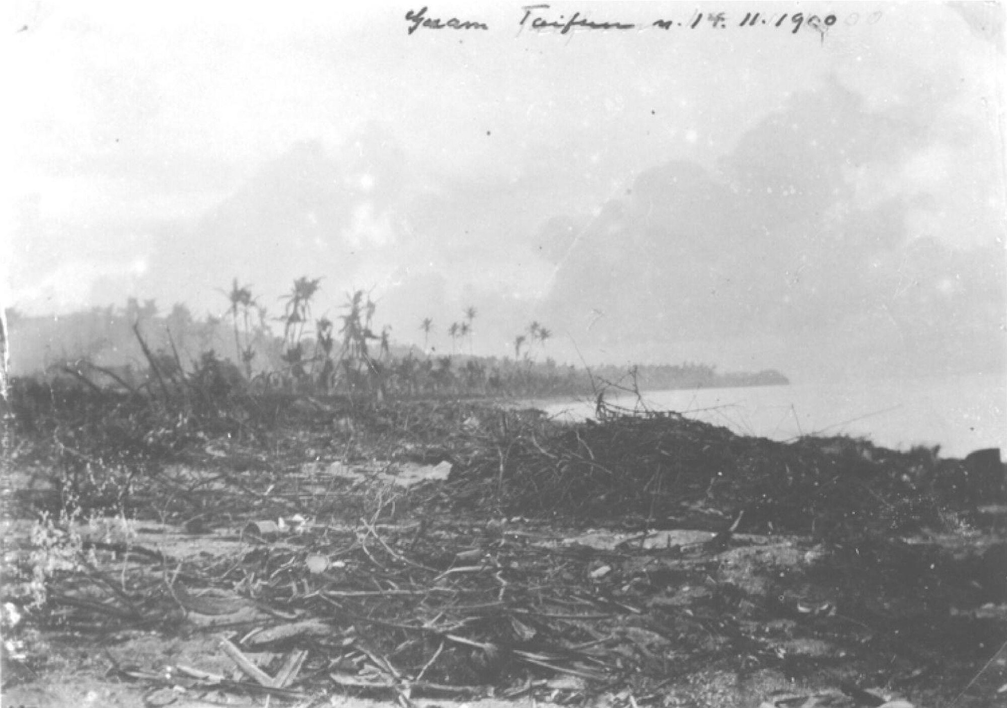 Devastation in Guam caused by a powerful typhoon that took place on November 13, 1900. The storm was so strong that the USS Yosemite was blown from her moorings. The vessel was tossed ashore and then pulled back out to sea. For two days the crew tried to save their ship, but she was scuttled after realizing the damage was too great. Image from the day after the storm via Wikimedia Commons, public domain