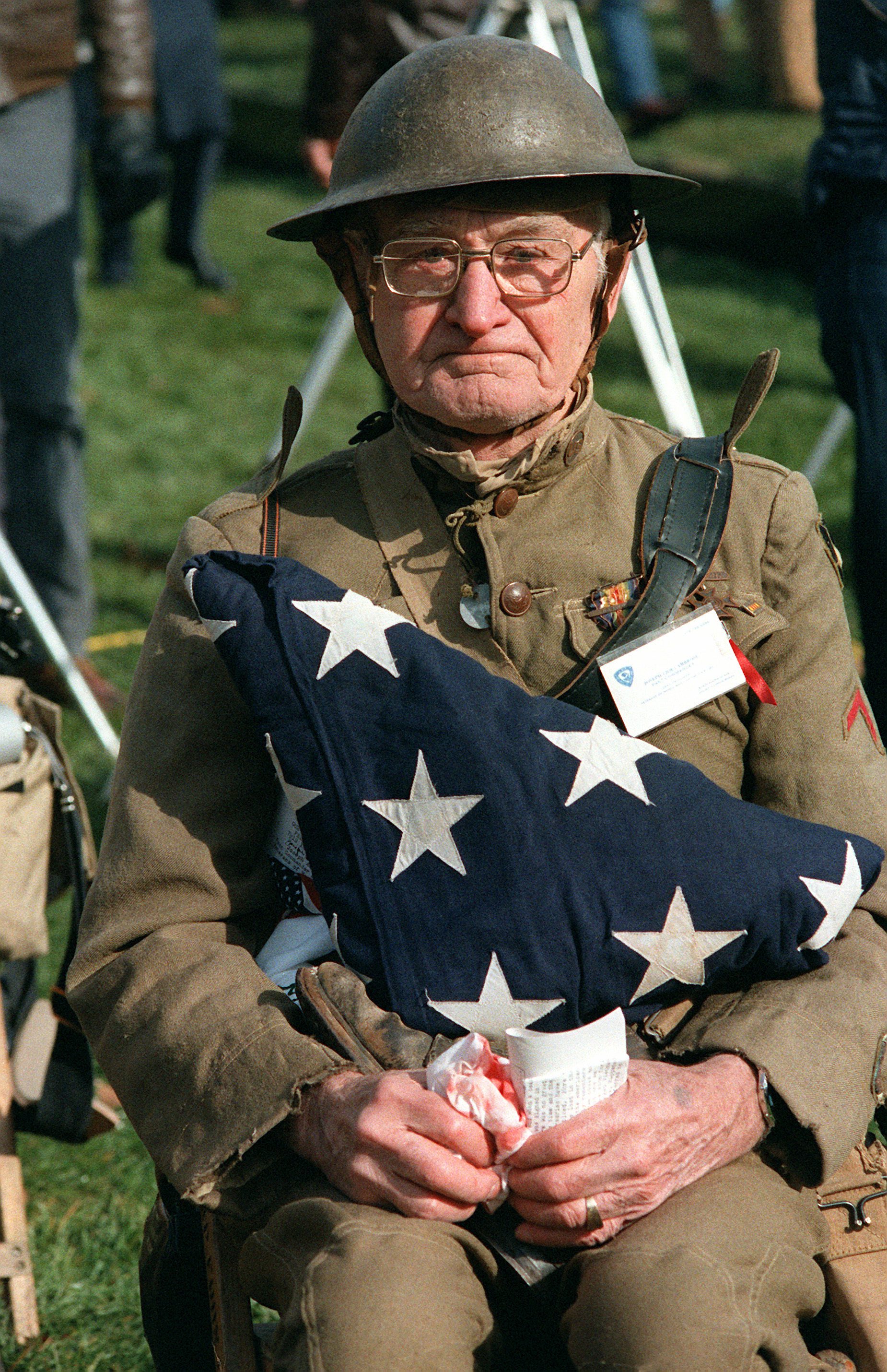 Joseph Ambrose, an 86-year-old World War I veteran, watches the dedication day parade for the Vietnam Veterans Memorial. He is holding the flag that covered the casket of his son, who was killed in the Korean War. November 13, 1982 Image via Wikimedia Commons, public domain