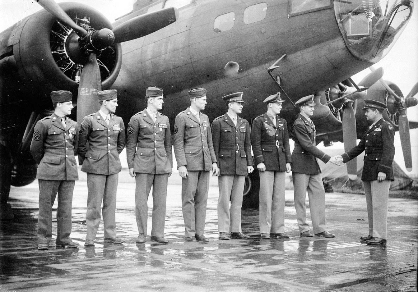Colonel Curtis LeMay commending this Flying Fortress crew following their daring mission during WWII. The crew pictured shot down numerous enemy aircraft before getting hit and crashing into the ocean. They spent thirty hours in the open sea before being rescued. Curtis LeMay was born on November 15, 1906 in Columbus, Ohio. Image via Wikimedia Commons, public domain