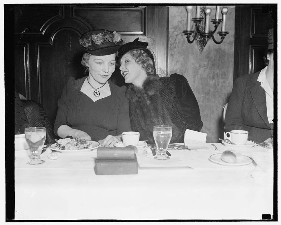 Mary Pickford leans toward the ear of newspaper editor Hope Ridings at a women’s luncheon in Washington D.C. – November 15, 1938 via Library of Congress, no known restrictions
