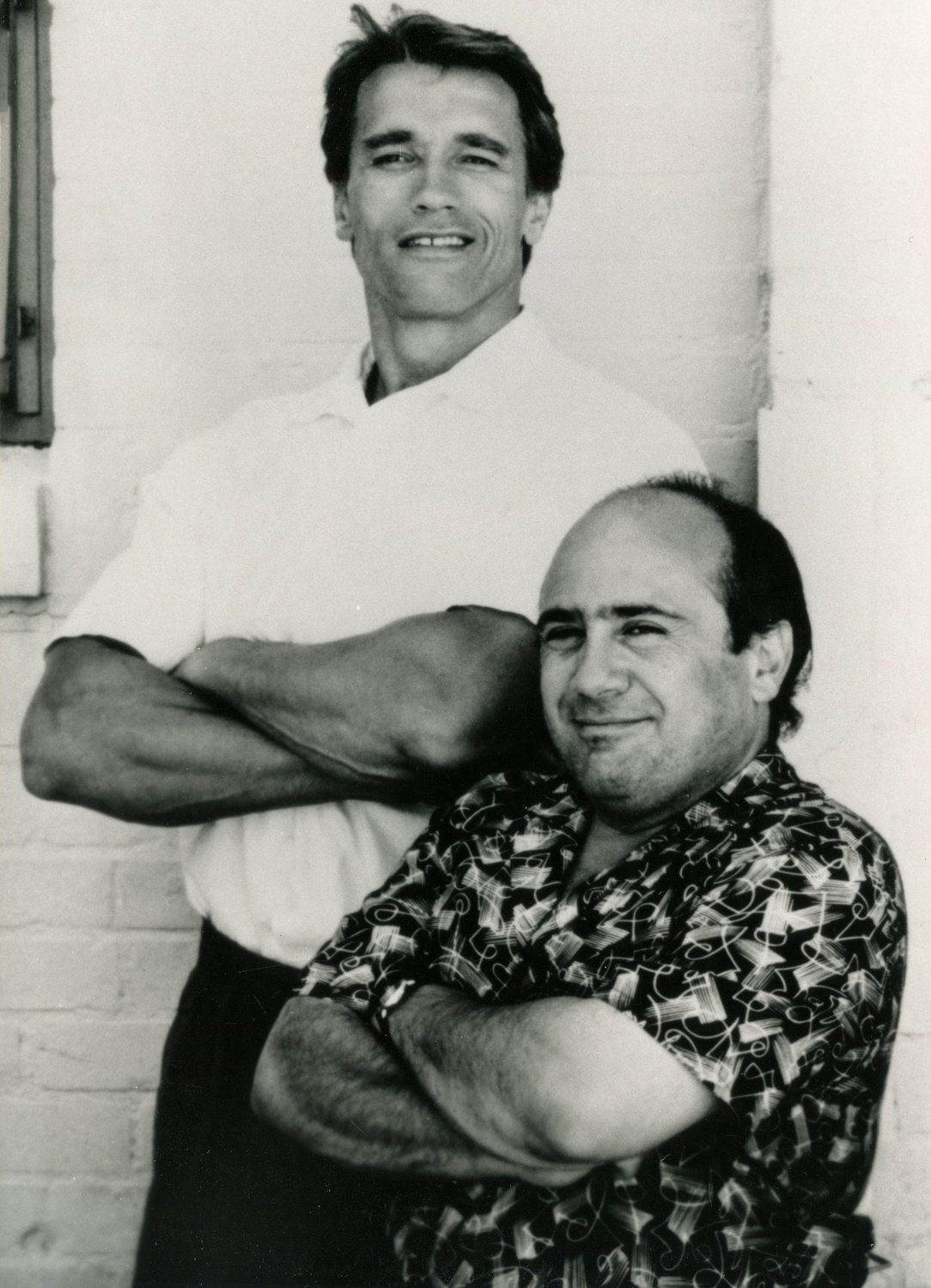 Danny DeVito and Arnold Schwarzenegger in the movie “Twins” from 1988. On November 17, 1944, Danny DeVito was born in Monmouth County, New Jersey. Image via Alamy