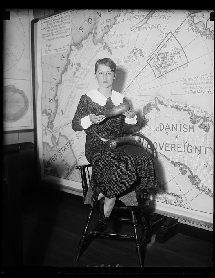 “The old and new in maps. Quite a contrast between the modern map in the background and the powder horn map being held by Miss Betty Jones at the Library of Congress. The horn maps, made from the horns of bullocks, were so much used in early Colonial Wars, 1739 to 1760, and during the Revolutionary War, that they were a necessary part in military equipment. They are considered the earliest American road maps, since they related principally to inland parts of the country, the skillful engraving showing New York, Quebec, and other early cities, and the trails leading to them. They also carried the British coat of arms and the name of the owner: In Colonial days the powder horn maps were given as prizes instead of silver loving cups as of today, and they were handed down from one generation to another as heirlooms.” – November 17, 1930 via Library of Congress, no known restrictions https://www.loc.gov/pictures/item/2016878953/