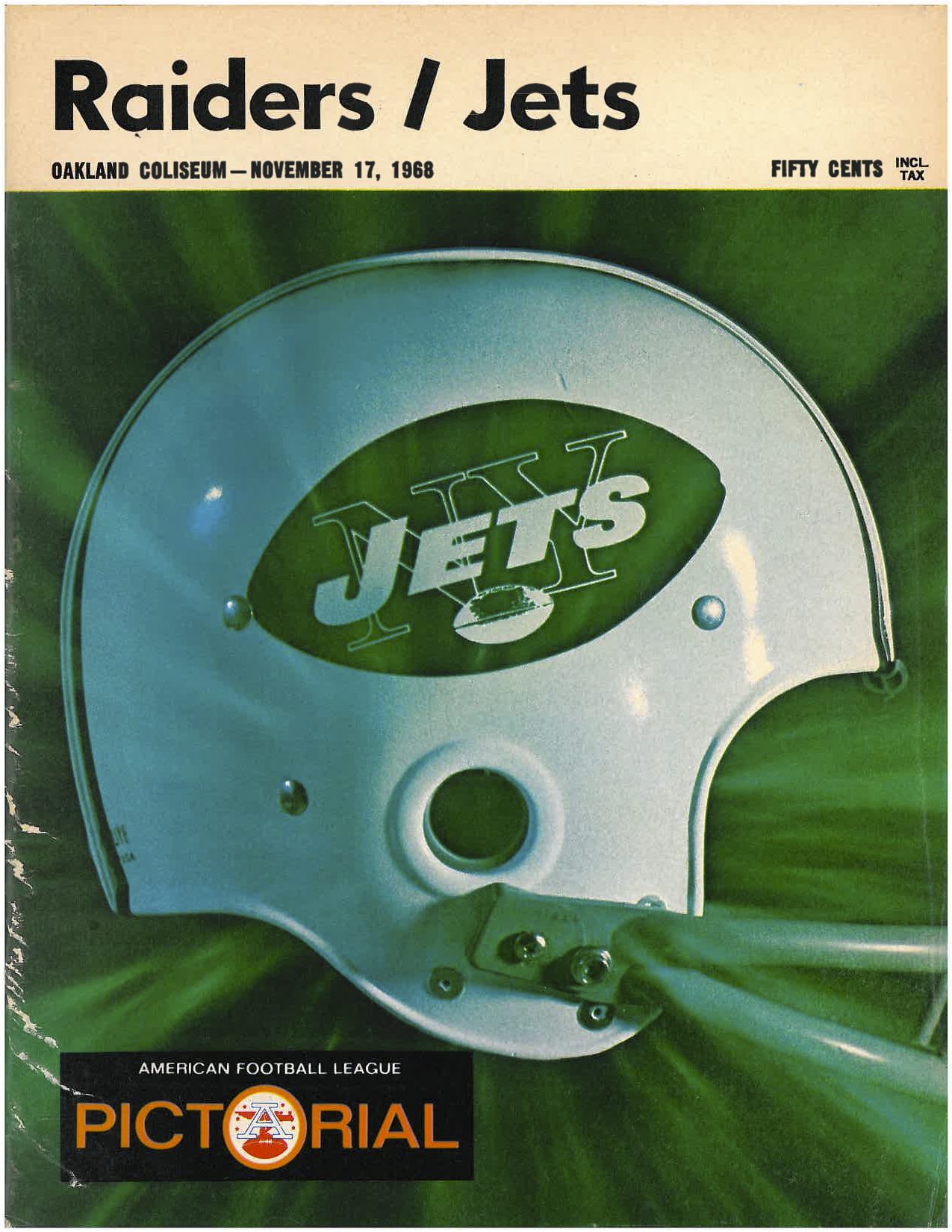 Cover of the official program of the pro-football game between the New York Jets and Oakland Raiders on November 17, 1968. The game is known as the “Heidi Bowl” because its broadcast was abruptly ended so that a movie “Heidi” could be televised. The final moments and winning plays by the Raiders didn’t air. Image via Wikimedia Commons, public domain