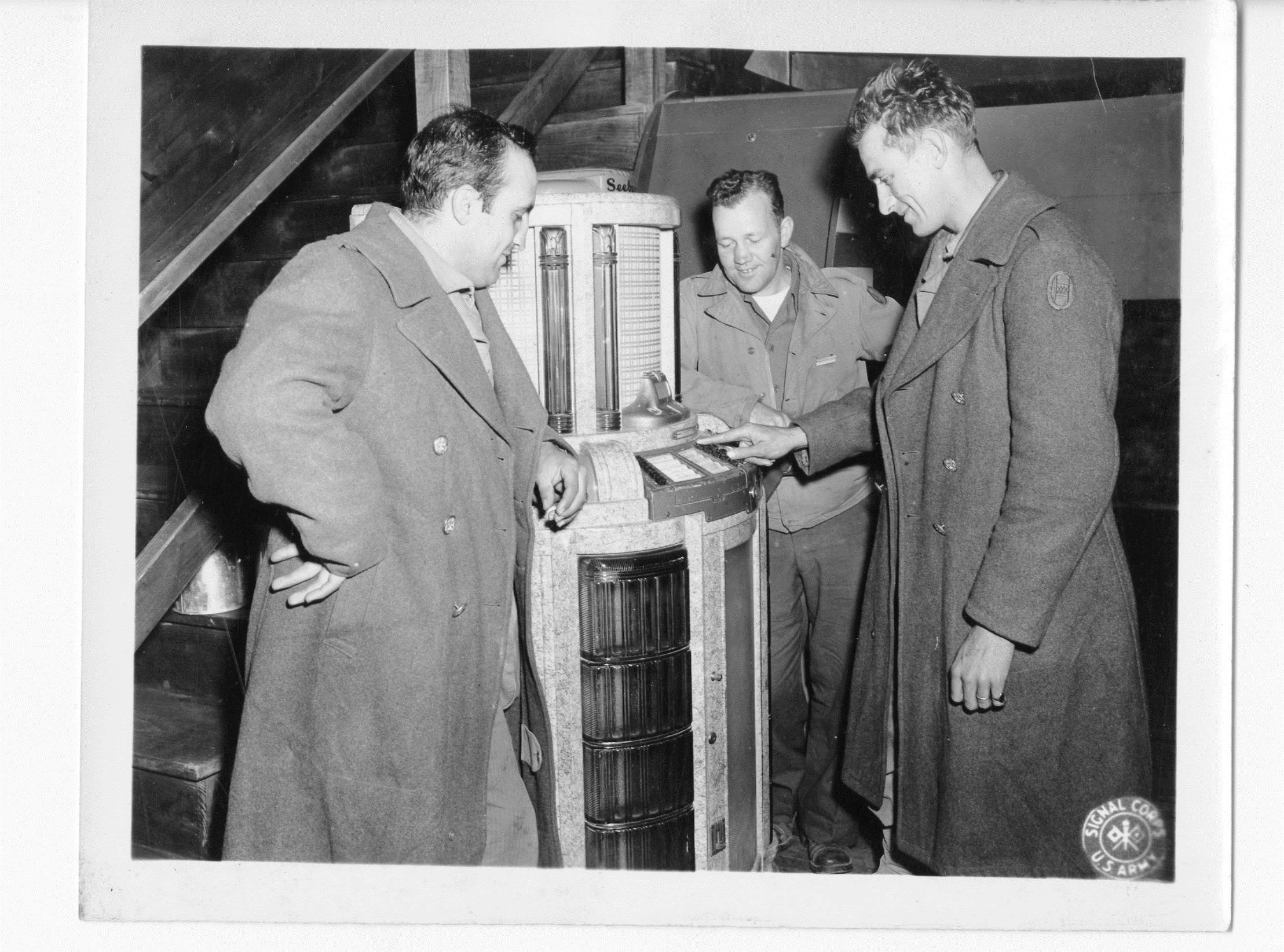 The first jukebox went into operation on November 23, 1889 at the Palais Royale Saloon in San Francisco. Image of three soldiers in overcoats listening to the jukebox at Service Club No. 1 at Camp Atterbury, Indiana during World War II (1943) via Wikimedia Commons, no known restrictions