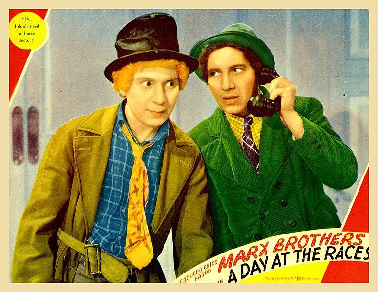 Born November 23, 1888, Harpo was an appropriate nickname for Arthur Marx, an accomplished harpist who was self-taught. The silent Harpo (left, with brother Chico) employed mime-like gestures and props in comedy roles but actually “had a deep, distinguished voice, like a professional announcer.” Wikimedia Commons, public domain in the US.